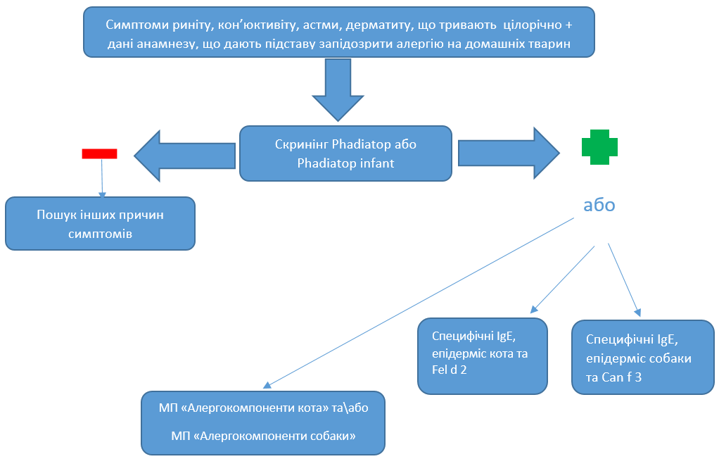 Враховуючи часті випадки полісенсибілізації у пацієнтів, діагностика алергії до домашніх тварин тільки на рівні екстрактів дає змогу визначити джерело первинної сенсибілізації, але для виявлення видоспецифічної сенсибілізації на рівні алергокомпонентів МЛ ДІЛА пропонує наступні