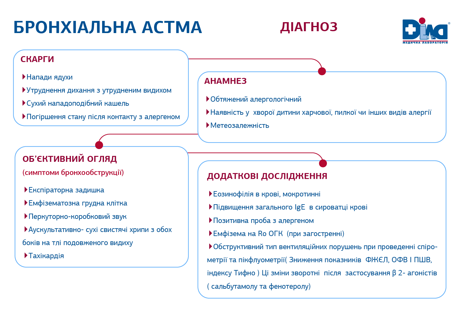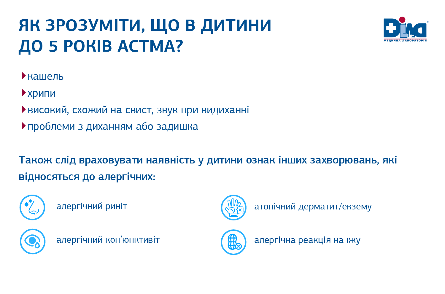 Необхідно враховувати наявність у дитини ознак інших захворювань, які відносяться до алергічних (хронічний риніт, хронічний кон’юнктивіт, атопічний дерматит/екзему, гостру реакцію на харчові продукти).