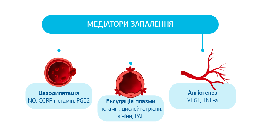 Алергічне запалення має кілька судинних ефектів, включаючи вазодилатацію, ексудацію плазми з посткапілярних венул і утворення нових судин (ангіогенез). NO: оксид азоту; CGRP: пептид, пов’язаний з геном кальцитоніну; PGE2: простагландин E2; PAF: фактор активації тромбоцитів; VEGF: судинно-ендотеліальний фактор росту; TNF-α: фактор некрозу пухлини-альфа.