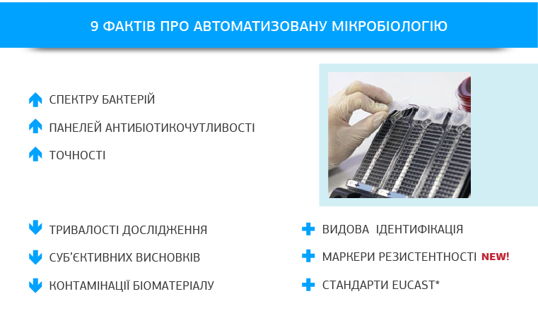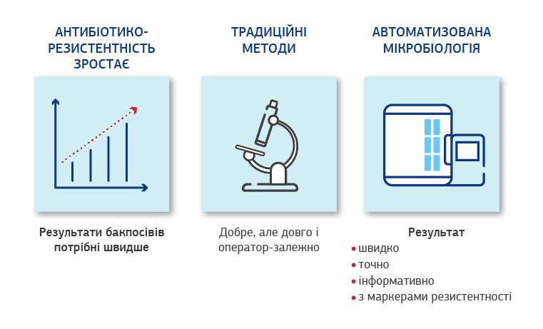 Автоматизована мікробіологія забезпечує всі вимоги цієї стратегії: результат бакпосіву швидше, з розширеними можливостями ідентифікації і антибіотикочутливості.