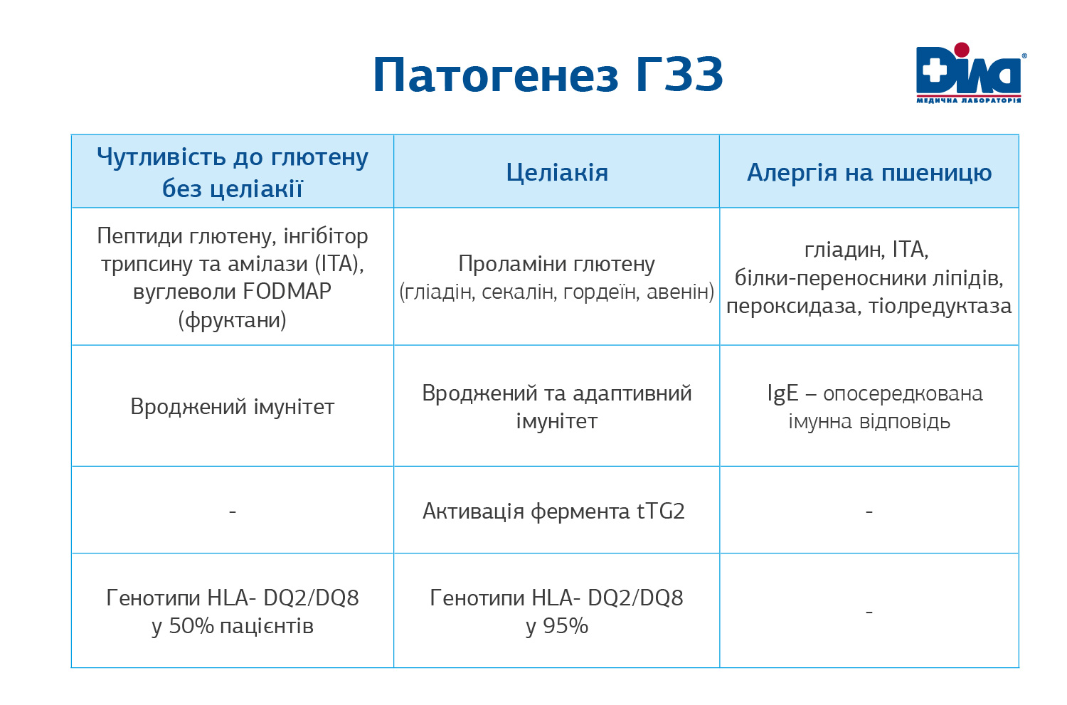 1.Тригери: для ЧГБЦ - пептиди глютену, ITA – інгібітор трипсину та амілази, вуглеводи FODMAP (фруктани). ІTA можуть бути основними кандидатами-винуватцями тяжких форм глютенової (пшеничної) чутливості. Проламіни глютену – гліадін, секалін, гордеїн, авенін є тригерами для Целіакії. Білки переносники ліпідів, гліадін, пероксидаза, тіолредуктаза, ITA - для алергії на пшеницю. ITA – це рослинні білки, що пригнічують ферменти звичайних паразитів (борошняних черв’яків і клопів, що живуть у пшениці), а також відіграють важливу роль у метаболічних процесах, які відбуваються під час розвитку насіння і варіюються між сортів 2. Зміни в імунітеті: вроджений, адаптивний або IgE-опосредкована імунна відповідь. Наразі існує гіпотеза про те, що ITA можуть бути саме тими довгоочікуваними індукторами вродженого імунітету у пацієнтів з целіакією або ЧГБЦ. Важливо усвідомлювати кількість ITA – це 2-4% у загальному білку сучасної пшениці, а з глютеном ця частка складає вже 80-90%! 3. При целіакії відбувається активація ферменту тканинної трансглутамінази. Тканинна трансглутаміназа – це головна мішень антигенів при целіакії, що призводить до запуску Т-клітинного аутоімунного процесу 4. Щодо ролі генетичної діагностики: Особи, які є носіями генів HLA-DQ2 та/або HLA-DQ8, мають високий ризик розвитку патологічного стану, для нього характерна аномальна реакція організму на глютеновмісні продукти. Визначаються генотипи HLA- DQ2/DQ8 у 95% пацієнтів при целіакії та у 50% пацієнтів для ЧГБЦ.