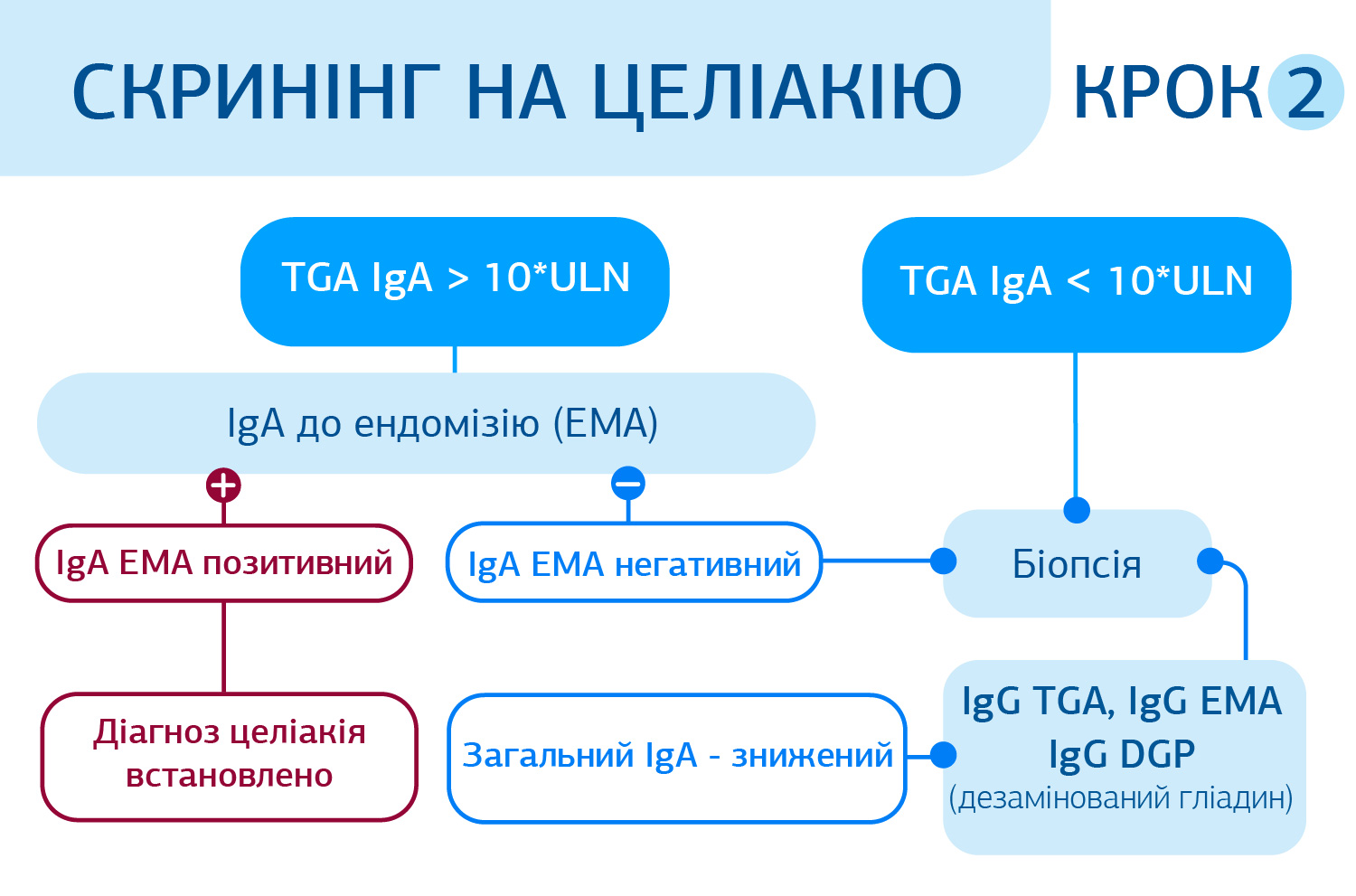 «Для початкової лабораторної діагностики рекомендують визначити рівні загального імуноглобуліну класу А (IgA) та IgA до тканинної трансглутамінази типу 2 (TGA-IgA), оскільки це є найбільш точним і економічно виправданим методом». European Society for Pediatric Gastroenterology, Hepatology and Nutrition; ESPGHAN 2020