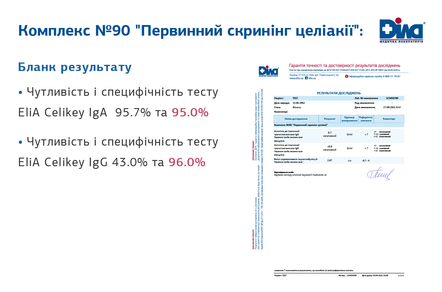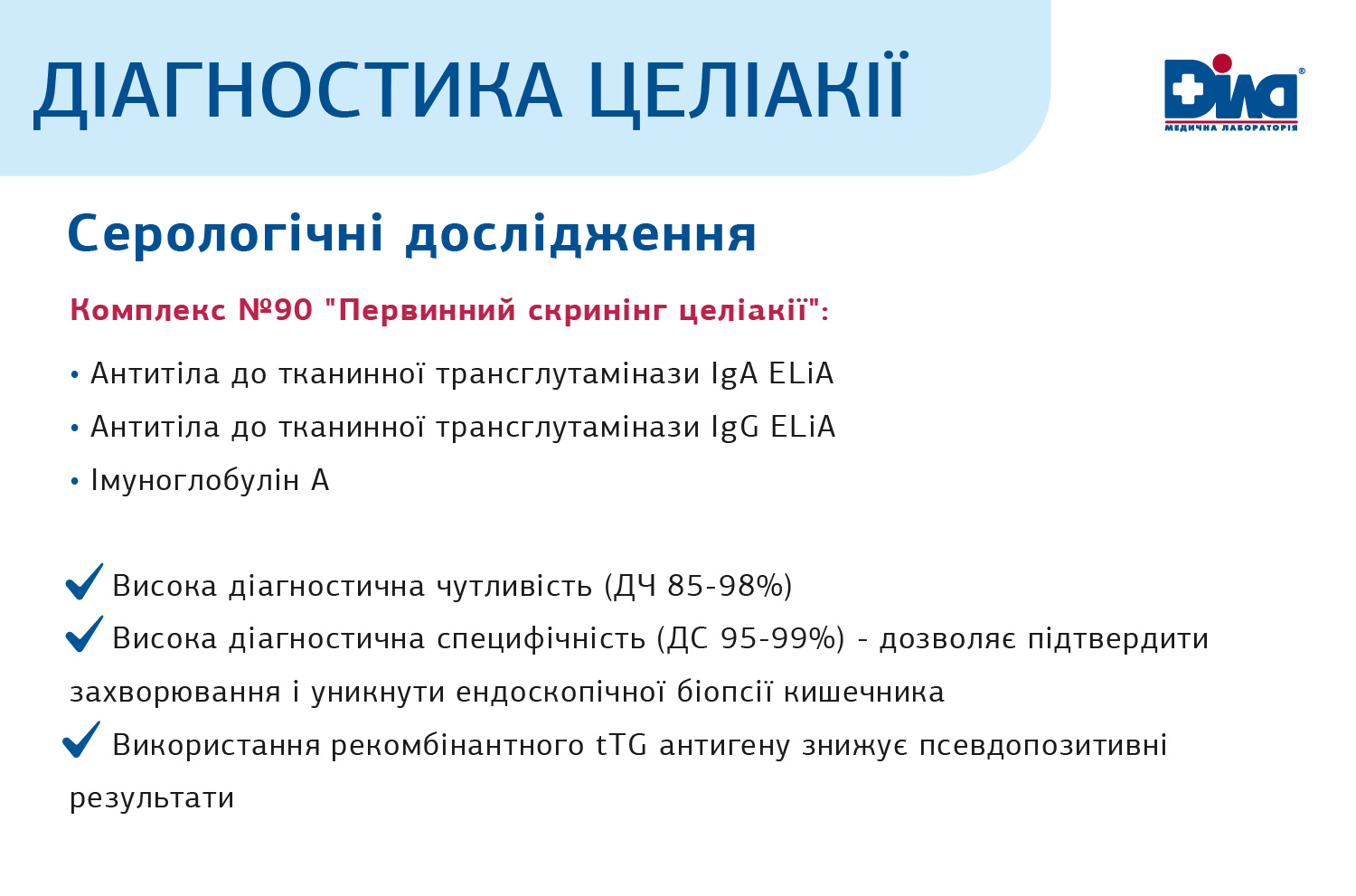 Для діагностики целіакії МЛ «ДІЛА» рекомендує комплекс досліджень «Первинний скринінг целіакії» № 90, який з високою точністю дозволить виявити захворювання та розробити подальшу тактику ведення пацієнтів, адже: