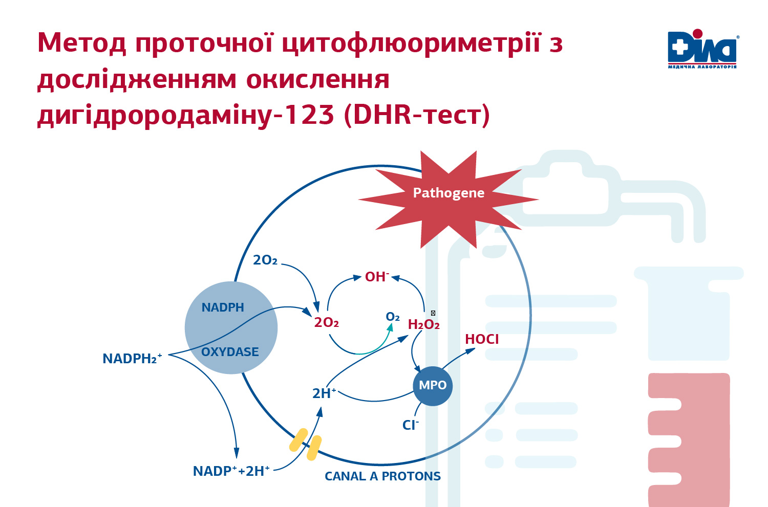 Оцінка функціональної активності гранулоцитів в ДІЛА здійснюється методом проточної цитофлюориметрії з дослідженням окислення дигідрородаміну123 (DHR-тест). Тест базується на стимуляції клітин крові бактеріями E.coli. Під час процесу поглинання бактерій фагоцити активують NADPH-оксидазу з подальшим утворенням активних форм кисню (окислювальний вибух). Іони гіпохлориду всередині фагоциту окислюють дигідрородамін 123 (DHR123) у флюорисцентний родамін 123, який детектується на проточному цитометрі. У пацієнтів з хронічною гранулематозною хворобою знижена або відсутня активність НАДФH -оксидази, що призводить до зменшення або відсутності перетворення DHR на флуоресцентний родамін.