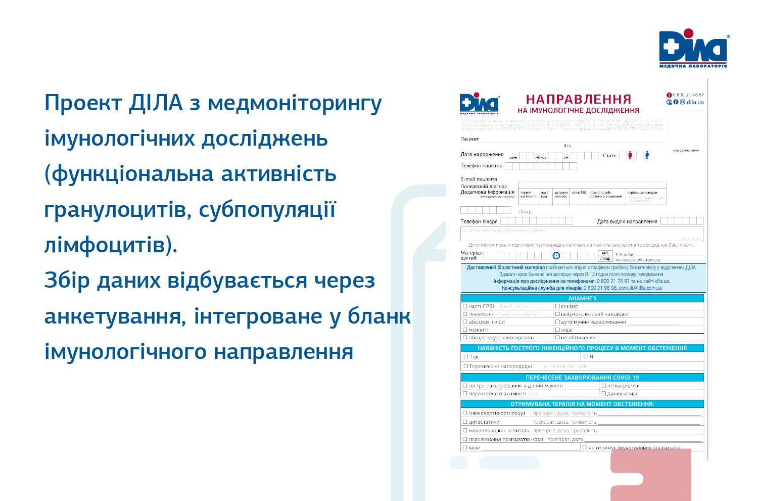 Для уточнення сили впливу тих чи інших факторів на імунологічні показники та мінімізації суб’єктивізації інтерпретації в ДІЛА працює проєкт медичного моніторингу імунологічних досліджень (функціональна активність гранулоцитів, субпопуляції лімфоцитів) шляхом заповнення анкет, інтегрованих в бланк імунологічного направлення:
