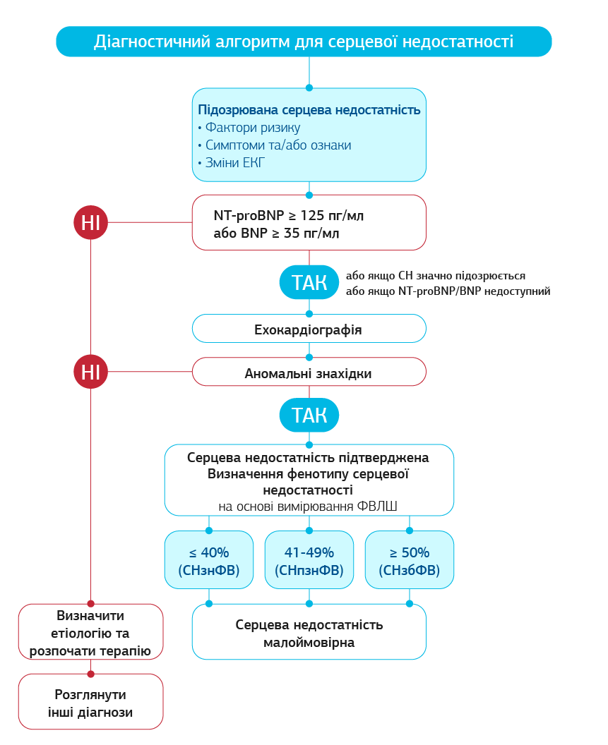 Сучасні клінічні рекомендації Європейського товариства кардіологів, Американського коледжу кардіологів/Американської асоціації серця та Американської асоціації з серцевої недостатності надають великого значення вдосконаленню методів ранньої діагностики, профілактики й індивідуалізованого лікування СН [3]. Передбачається, що біологічні маркери, які відбивають різні патофізіологічні стадії СН, зберігають своє значення як потужний інструмент діагностики гострої та хронічної СН, стратифікації пацієнтів у групи високого ризику виникнення та прогресування СН, а також в якості ймовірного предиктора ефективності лікування СН. Відповідно до рекомендацій Європейського товариства, що були прийняті в цьому році, був запропонований алгоритм діагностики СН, де для підтвердження діагнозу можна використовувати рівень мозкового натрійуретичного пептиду (BNP) та його попередника при наявності відповідних скарг навіть до проведення інструментальних методів обстеження, зокрема ЕхоКГ (Рис. 2). Це дослідження є важливим особливо для сімейних лікарів при неможливості проведення ехокадіографії або ж для пацієнтів з міокардитом, у яких фракція викиду перевищує 50%.
