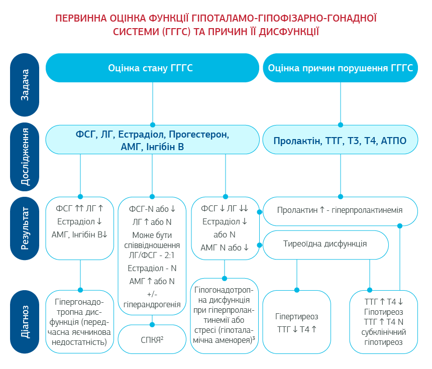 За наявності у жінки даних за порушення менструального циклу, надмірний ріст волосся в гормонозалежних зонах, втрату волосся, акне, коливання маси тіла доцільною є оцінка таких гормональних показників як: ФСГ, ЛГ, пролактин, ТТГ, індекс вільного тестостерону.