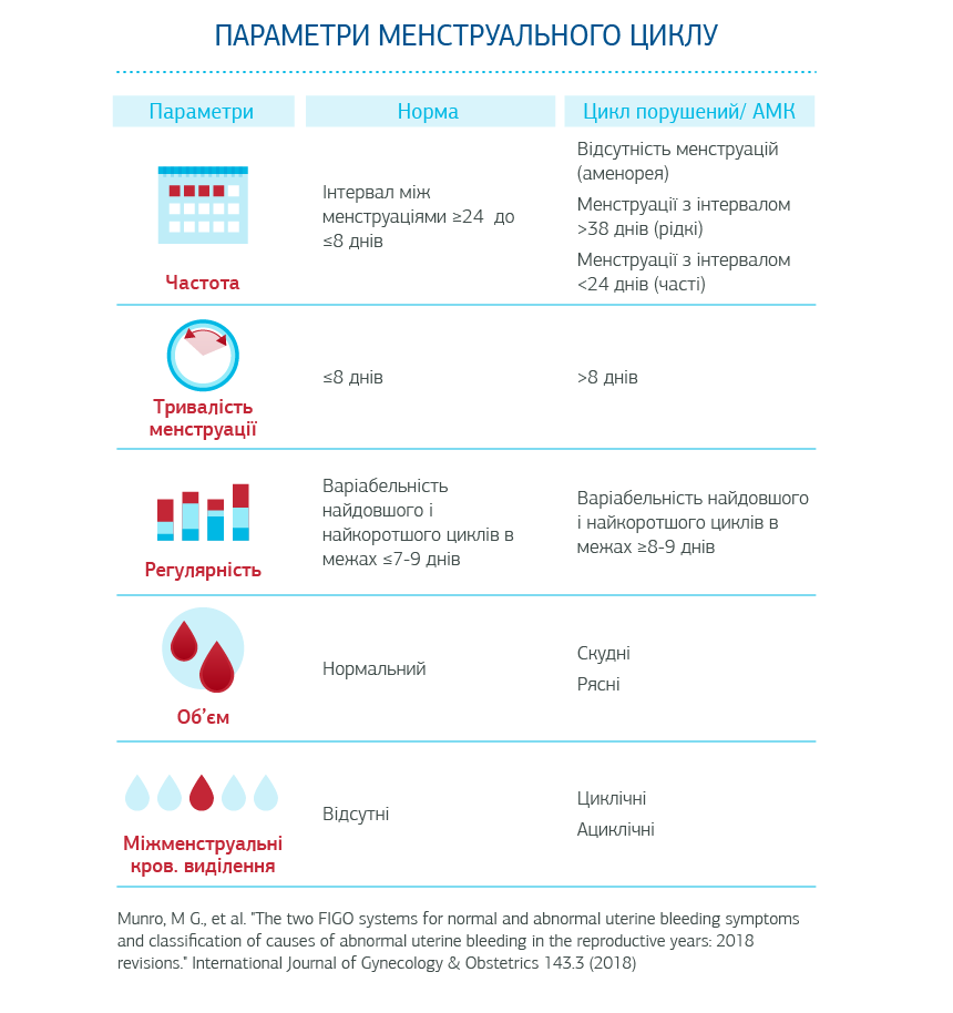 Як і всі показники життєдіяльності організму характеристики менструального циклу мають певну варіабельність. І все ж дослідження дозволили встановити межі таких параметрів циклу як частота менструацій, тривалість менструації, регулярність, об’єм, та наявність міжменструальних кров’янистих виділень.