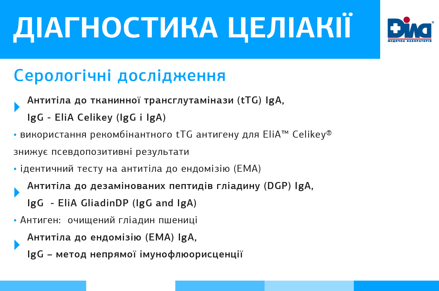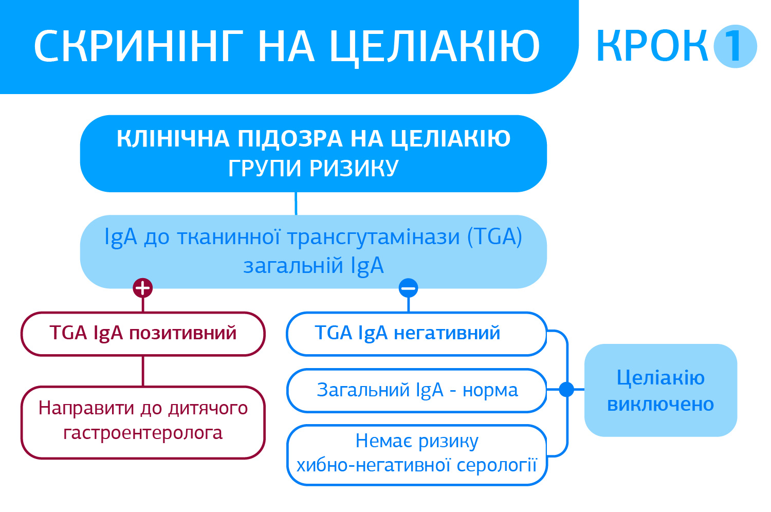 - скринінгове дослідження у групах підвищенного ризику захворюваності на целіакію;