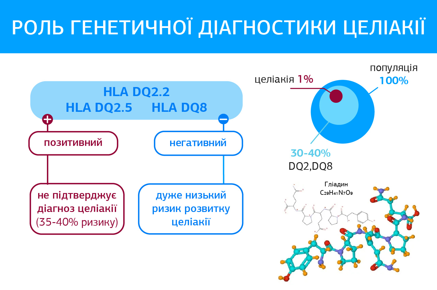 Генетичні дослідження виключають, а не підтверджують діагноз, оскільки 35-40% популяції є носіями генів, які асоційовані з целіакією, згідно рекомендацій (Al-Toma A, Volta U, Auricchio R, et al. European Society for the Study of Coeliac Disease (ESsCD) guideline for coeliac disease and other gluten-related disorders. United European Gastroenterol J. 2019;7(5):583-613. doi:10.1177/2050640619844125). У пацієнтів з підтвердженою целіакією визначаються HLA-DQ2.5 – у 90-95%, а HLA-DQ2.2 та HLA-DQ8 – у 5-10%. Відсутність генотипів HLA-DQ2 або DQ8 виключає діагноз целіакії.
