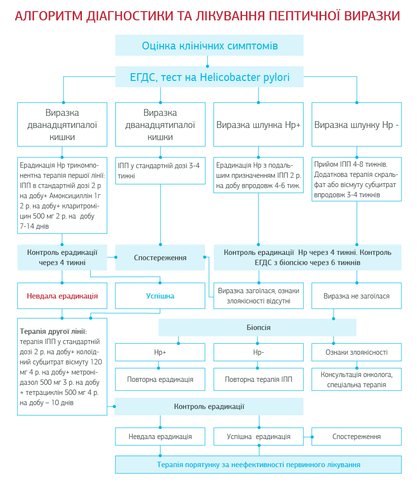 •  До отримання результатів біопсії для полегшення симптомів пептичної виразки за необхідності можуть бути призначені антагоністи Н2-рецепторів, антациди, альгінати, спазмолітичні засоби.