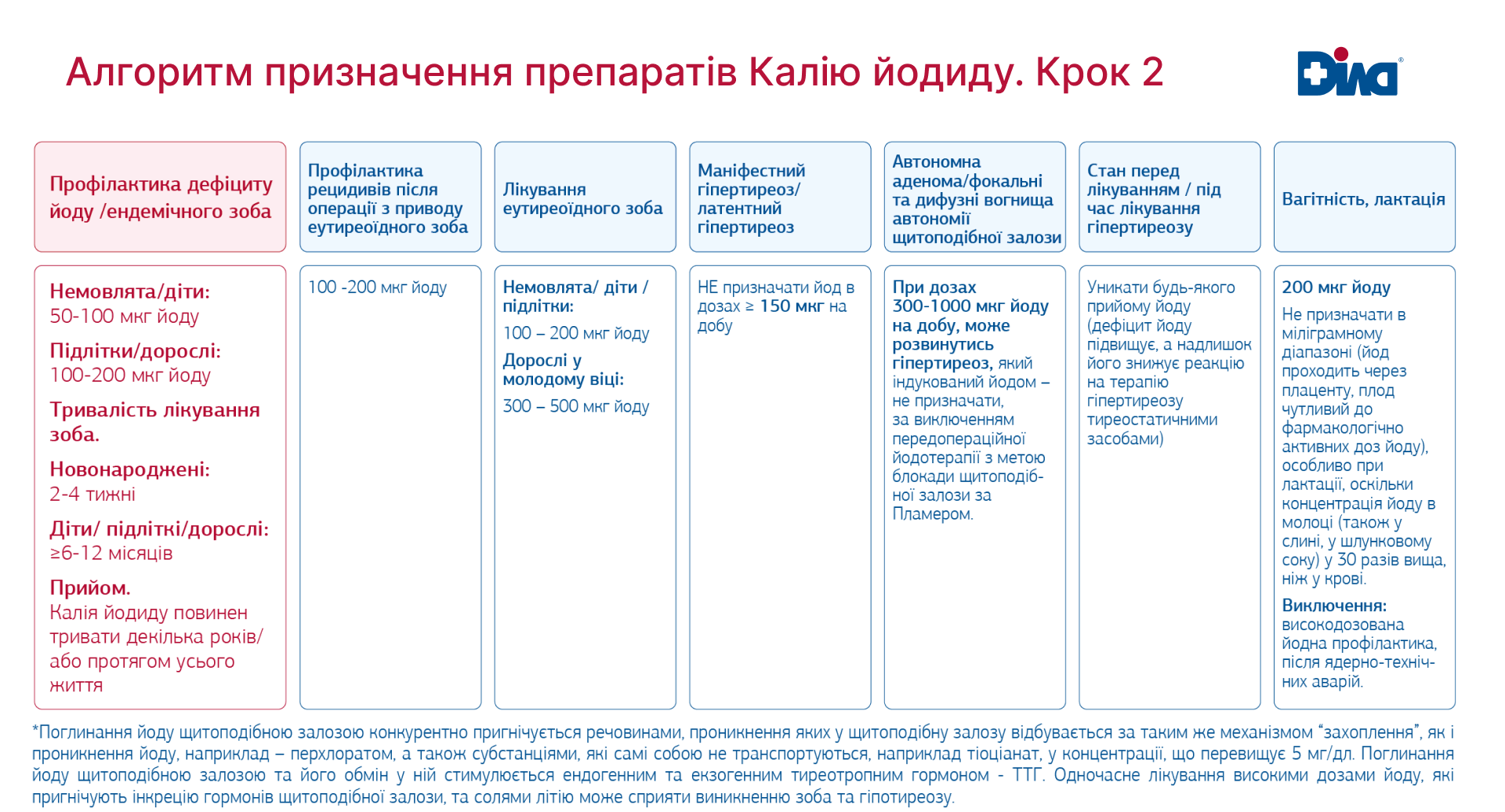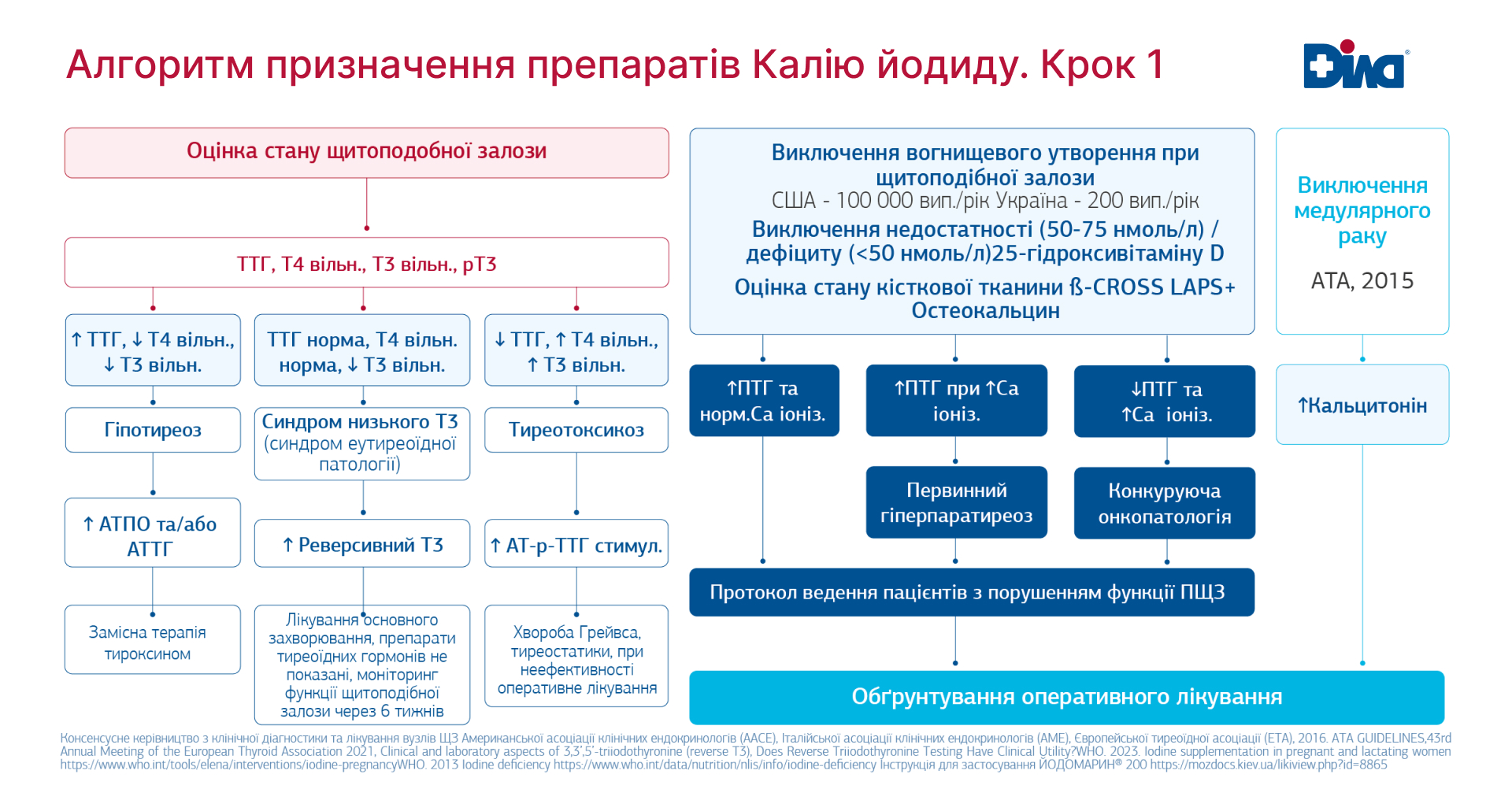 Враховуючи, що наслідки передозування йоду для стану здоров’я не менш важкі, аніж наслідки йододефіциту, в жодному разі не можна вживати калію йодид «про всяк випадок», без показань та попереднього обстеження. Для вирішення клінічної задачі «Оцінка рівня йодного насичення організму» експерти ДІЛА надають лікарям сучасні алгоритми обстеження пацієнта та призначення препаратів калію йодиду.