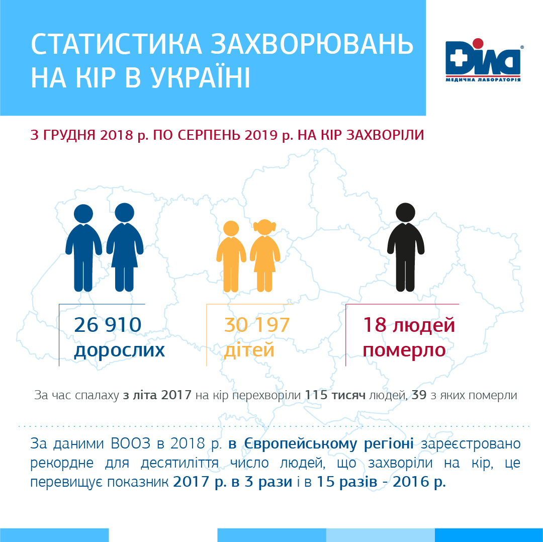 В Україні згідно з офіційною статистикою з початку року (з 28 грудня 2018 року до 9 серпня 2019 г.) на кір захворіли 57 107 людей - 26 910 дорослих і 30 197 дітей, від ускладнень кору померло 18 людей. За час спалаху з літа 2017 на кір перехворіли 115 тис. людей, 39 з яких померли.