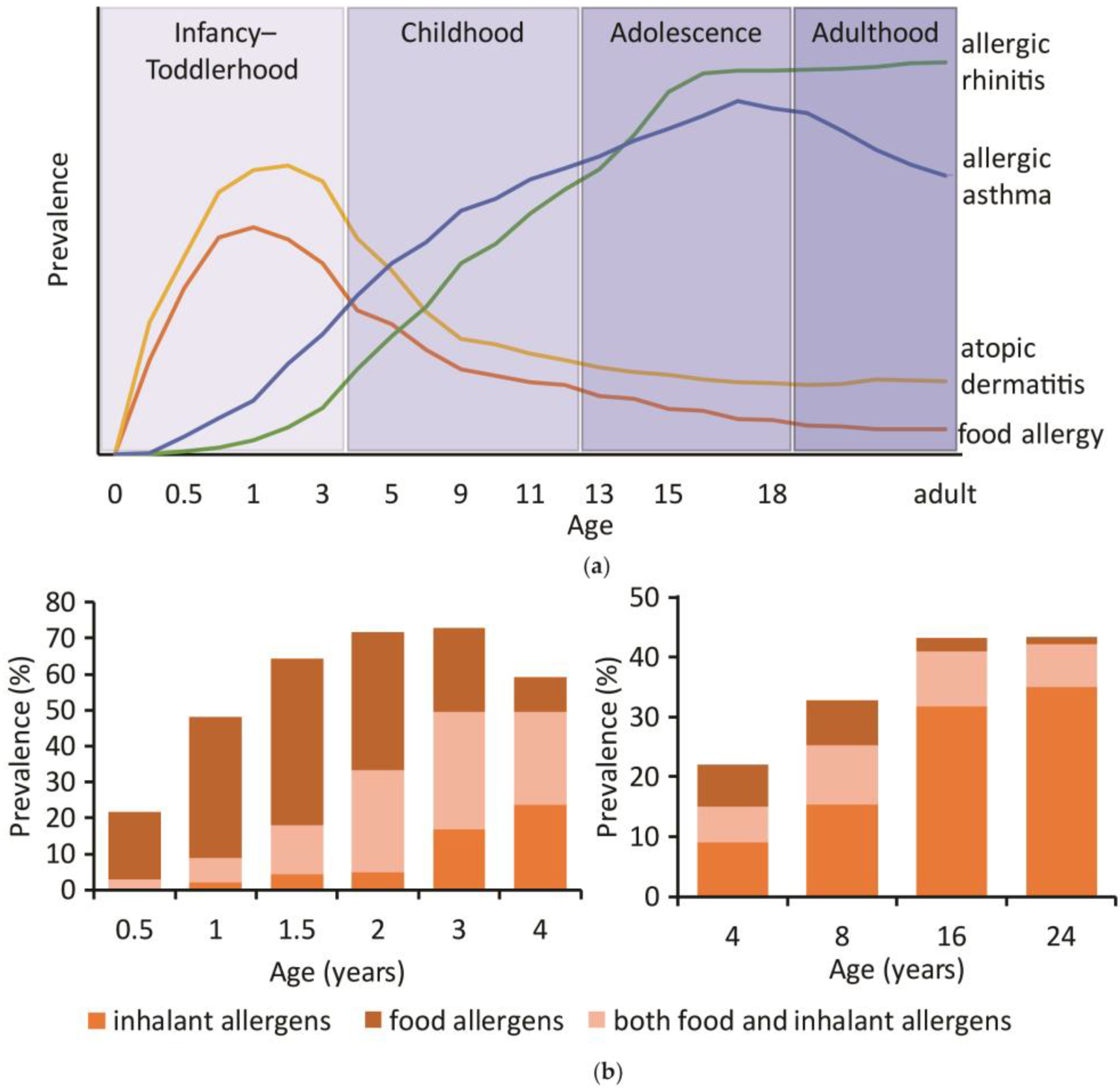 Рисунок 1. Прогрессирование аллергии и сенсибилизации с течением времени: (а) прогрессирование аллергических проявлений от детства до взрослого возраста, адаптировано из Tsuge et al. (b) прогрессирование сенсибилизации к пищевым, ингаляционным аллергенам, а также к пищевым и ингаляционным аллергенам в детском и дошкольном возрасте, адаптировано из Chiu et al. и от детства до взрослого возраста адаптировано из Melén et al.