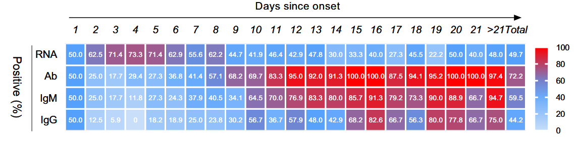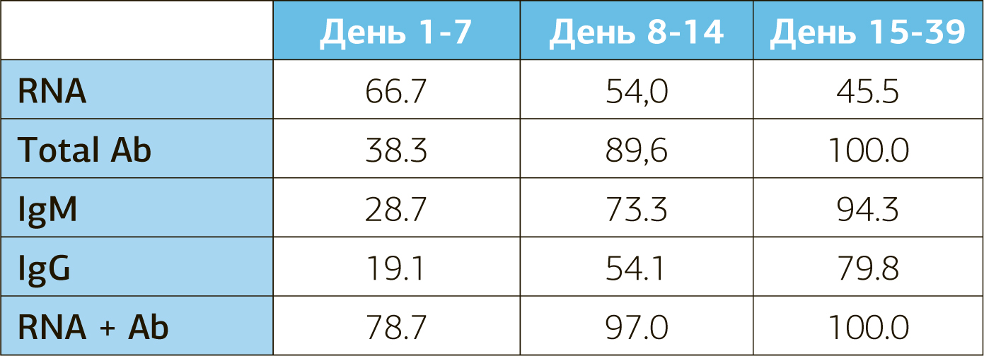 Исследователи пришли к выводу, что в зависимости от времени, прошедшего с начала коронавирусной болезни, лабораторные методы исследований материала из верхних дыхательных путей, имеют различную диагностическую ценность. Стоит сочетать ПЦР исследования с серологическими методами, что позволит увеличить чувствительность диагноза «COVID-19» до 100% с 15 дня болезни (см. Табл).