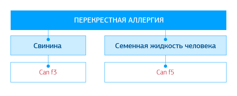 Исследования показывают наличие перекрестной реактивности между Can f 1 и липокалином слезы человека. Can f 5 демонстрирует определенную гомологию с простатоспецифическим антигеном (PSA), принадлежащим к семейству калликреинов. Предполагается, что предыдущая сенсибилизация к Can f 5 может быть связана с развитием аллергических реакций на семенную жидкость человека.