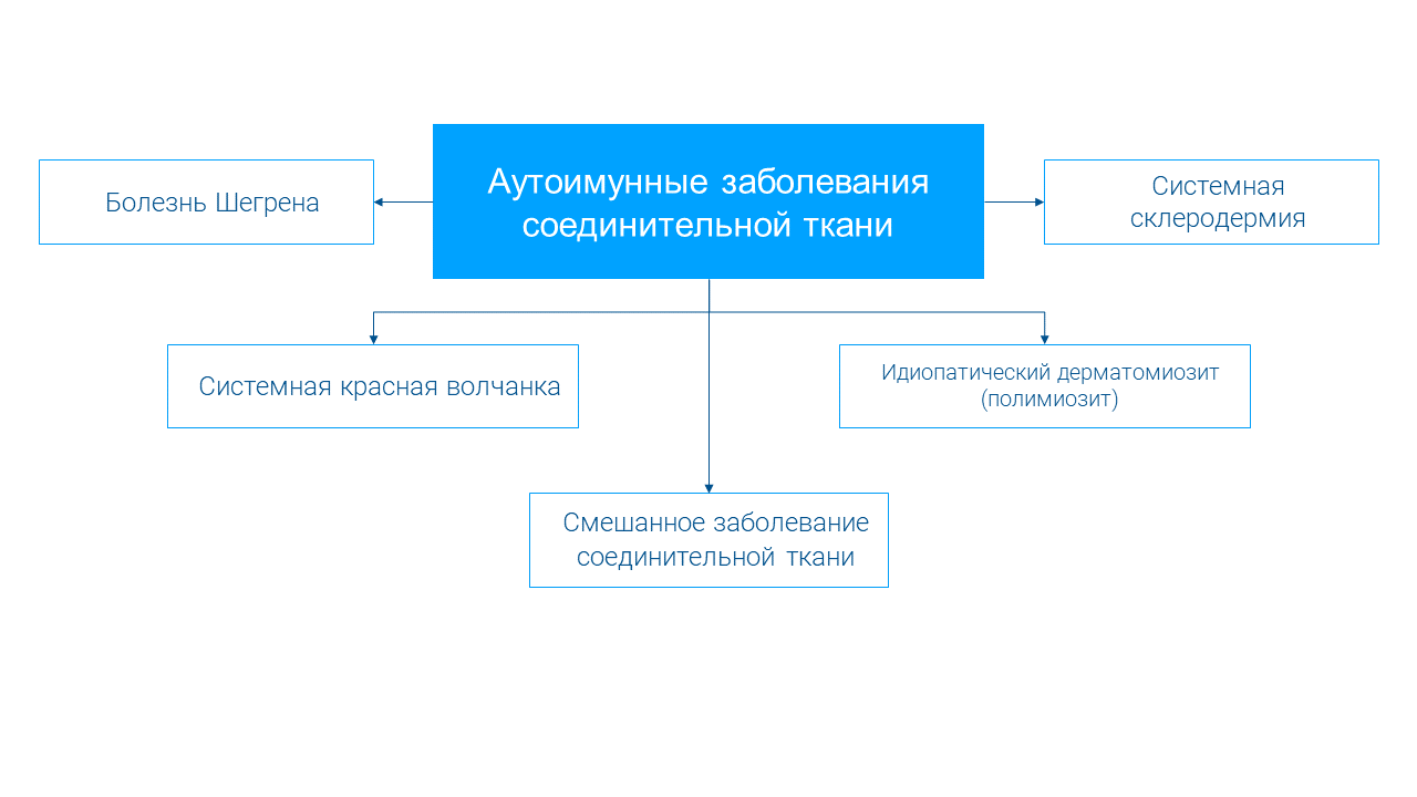 Аутоиммунные заболевания соединительной ткани (АИЗСТ) – это большая группа заболеваний с тяжелым течением неизвестной этиологии, которые характеризуются генетически обусловленным системным иммуновоспалительным поражением соединительной ткани и ее производных, что проявляется множественным поражением органов и тканей и имеет полициклическое прогрессирующее течение. Они относятся к гетерогенной группе заболеваний и синдромов, характеризующихся одним признаком – нарушением таких структур, как коллаген и эластин.