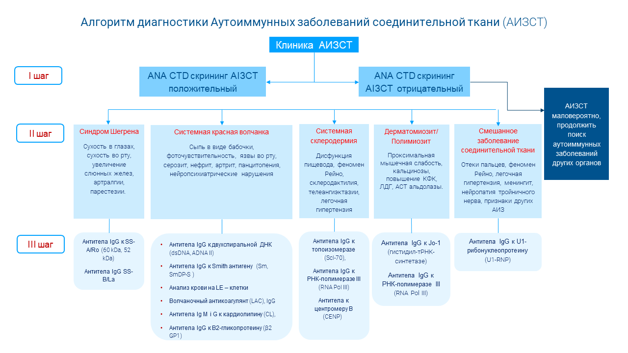 II этап – специфическая диагностика, необходимая для верификации диагноза того или иного АИЗСТ согласно современным рекомендациям. Рекомендовано дальнейшее количественное определение отдельных сывороточных антинуклеарных антител для определения положительности в соответствии с подозреваемым заболеванием.