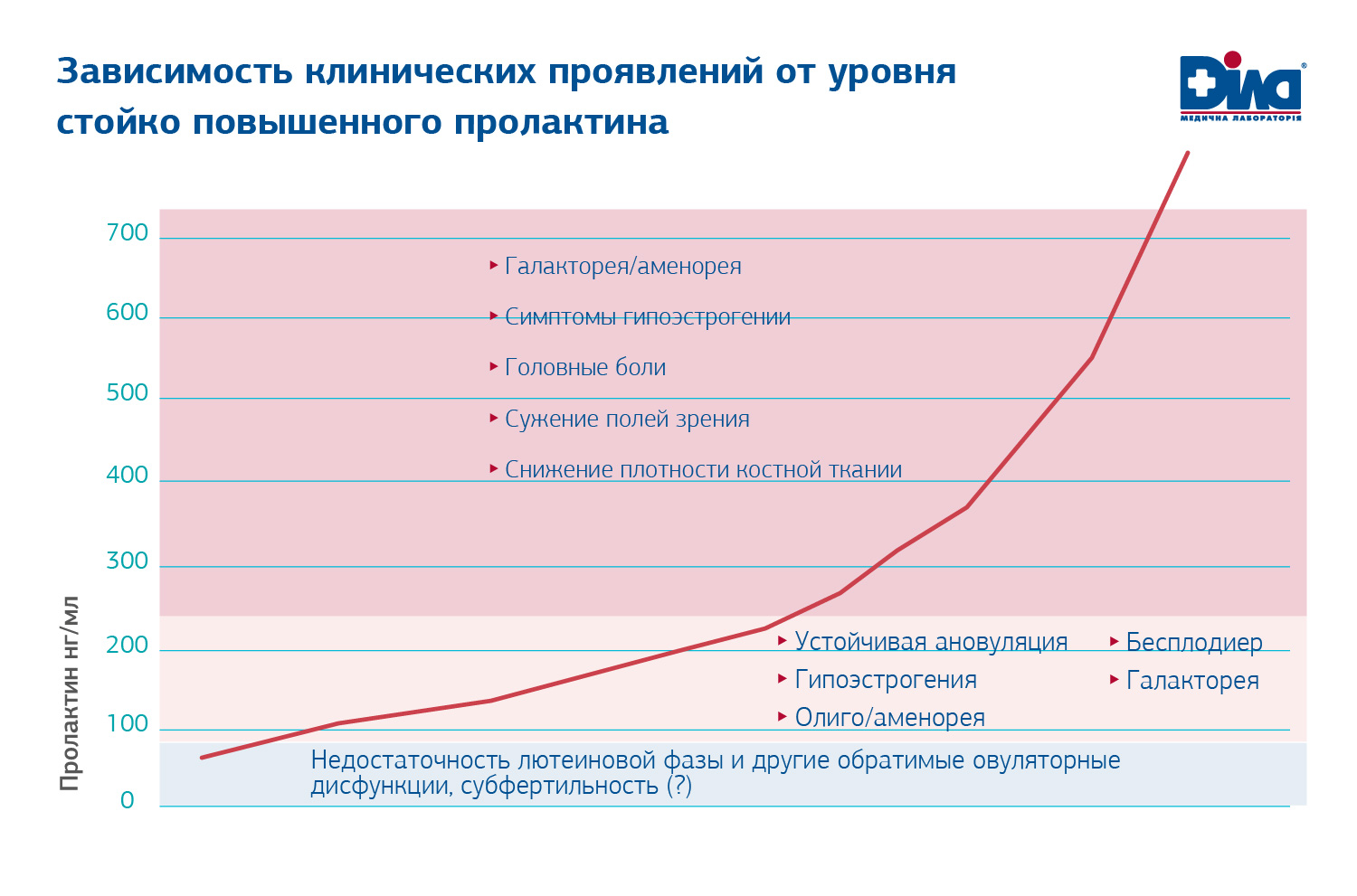 Уровень повышения пролактина показывает значительную корреляцию с причинами и симптомами. Так, уровни пролактина до 100 нг/мл в подавляющем большинстве случаев вызваны неопухолевыми причинами, а более 100 нг/мл гормонсекретирующими опухолями. Аналогичным образом, повышение пролактина до 100 нг/мл сопровождается в основном овуляторными дисфункциями и субфертильностью, а выше 100 нг/мл – синдромом галактореи-аменореи, метаболическими и неврологическими нарушениями.