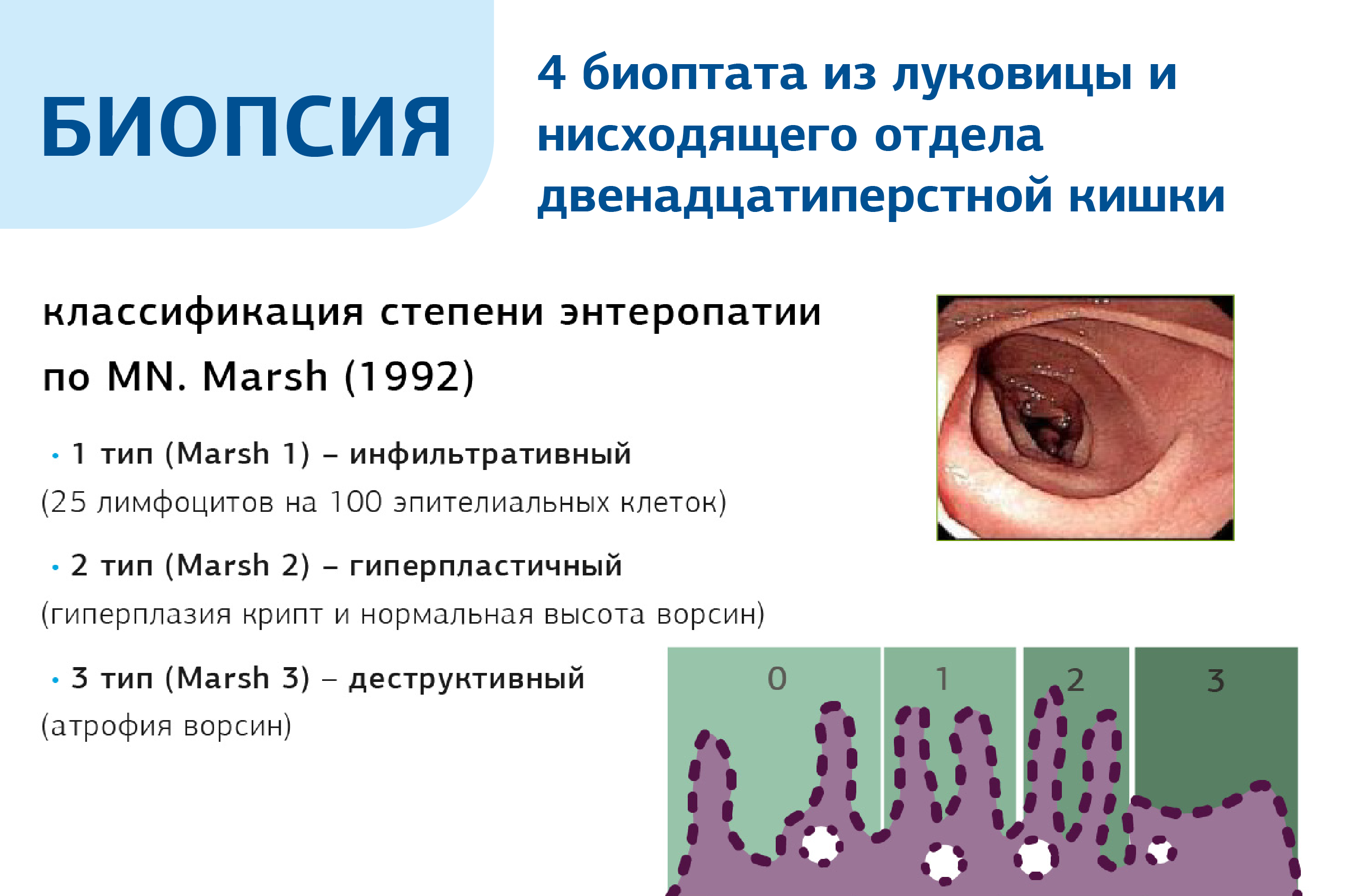 При сомнительных серологических тестах, следующим важным диагностическим этапом является биопсия слизистой тонкой кишки (залуковичных отделов двенадцатиперстной кишки) с обнаружением полной или практически полной атрофии ворсинок слизистой тонкой кишки. Забор биоптатов проводят из двенадцатиперстной кишки (1-2 из луковицы и 4-х из внелукового отдела). Характерным гистологическим признаком является атрофия кишечных ворсинок, сопровождающаяся увеличением количества эндоэпителиальных лимфоцитов и гипертрофией крипт. Гистологическое исследование слизистой тонкого кишечника в диагностике целиакии имеет основное значение.