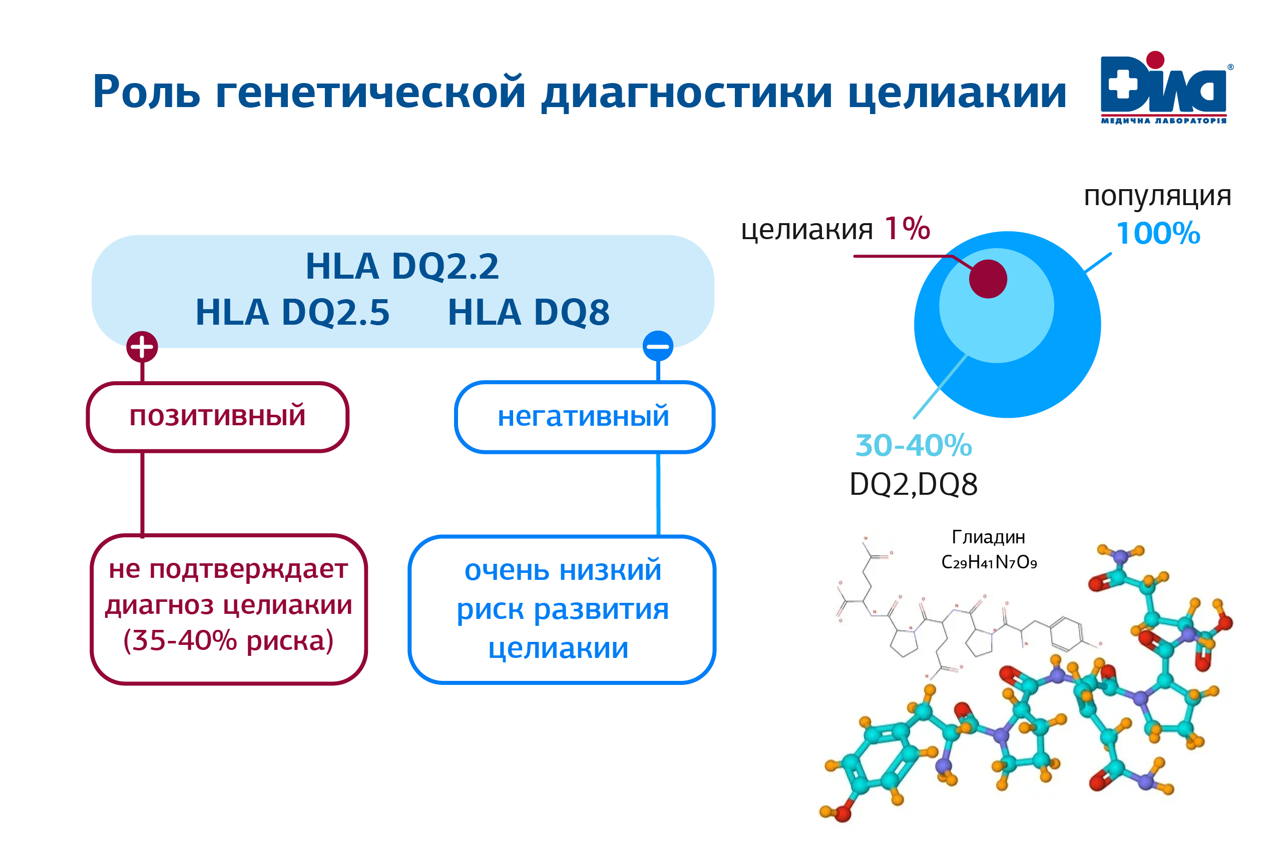 - Диагностика целиакии на основании положительного генетического обследования (HLA-DQ2/DQ8) без специфических серологических тестов!