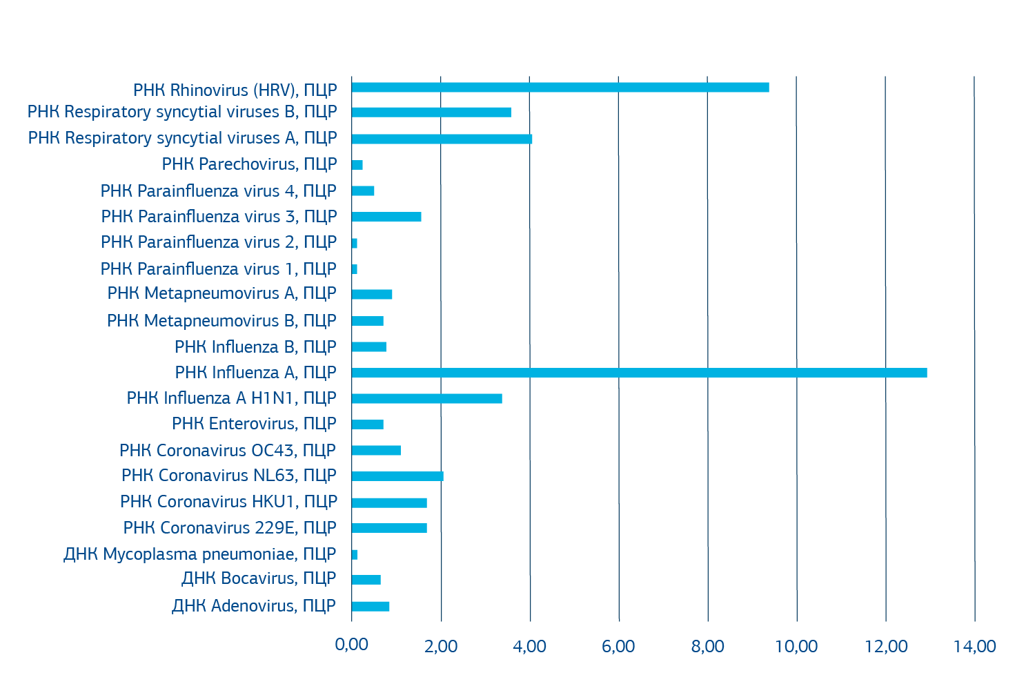 Указанный тест одновременно обнаруживает: 1. Adenovirus 2. Bocavirus 3. Coronavirus 229E 4. Coronavirus HKU1 5. Coronavirus NL63 6. Coronavirus OC43 7. Enterovirus 8. Metapneumovirus A 9. Metapneumovirus B10. Parechovirus11. Rhinovirus12. Influenza A13. Influenza B14. Influenza A H1N115. Parainfluenza Virus 16. Parainfluenza Virus 217. Parainfluenza Virus 3 18. Parainfluenza Virus 4 19. Respiratory Syncytial Virus A 20. Respiratory Syncytial Virus B 21. Mycoplasma pneumoniae