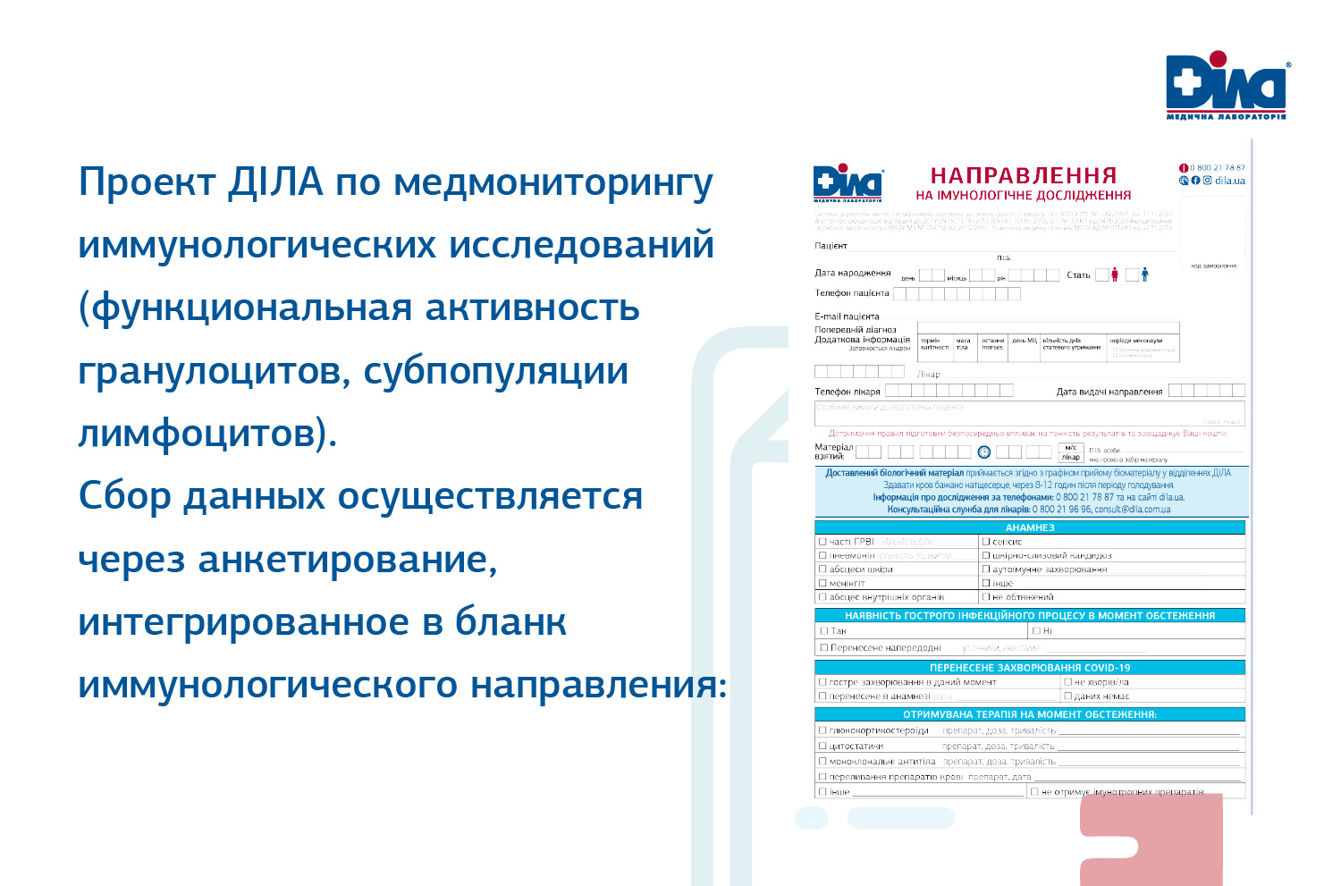Для уточнения силы влияния тех или иных факторов на иммунологические показатели и минимизации субъективизации интерпретации в ДІЛА работает проект медмониторинга иммунологических исследований (функциональная активность гранулоцитов, субпопуляции лимфоцитов) путем заполнения анкет, интегрированных в бланк иммунологического направления: