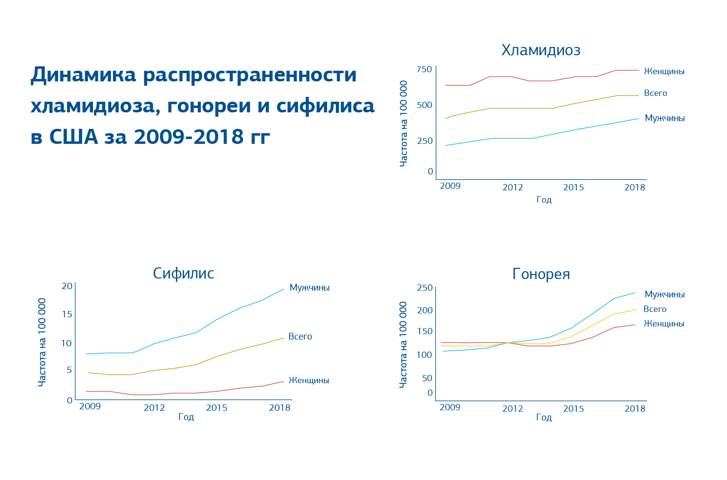 Эпидемиологические исследования демонстрируют значительный рост частоты ИППП на протяжении последних декад. Особую роль в этом сыграла пандемия коронавирусной инфекции, которая ограничивала доступ к обследованию (1,4).