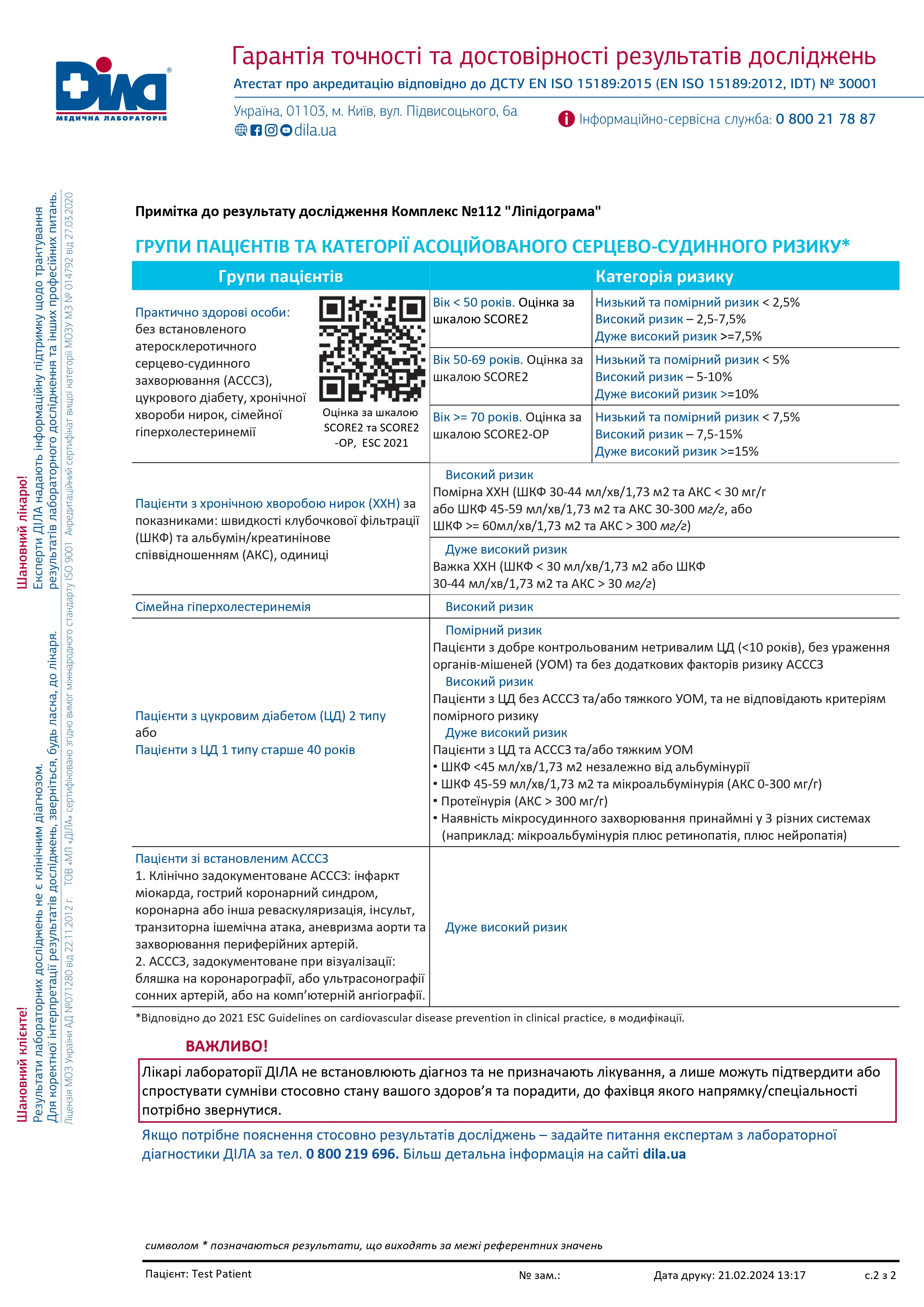 Для диагностики нарушений липидного обмена ДІЛА предлагает Комплекс 112 «Липидограмма», предназначенный для оценки сердечно-сосудистого риска практически здоровых лиц, обследования пациентов с сердечно-сосудистыми заболеваниями и мониторинга эффективности гиполипидемической терапии.