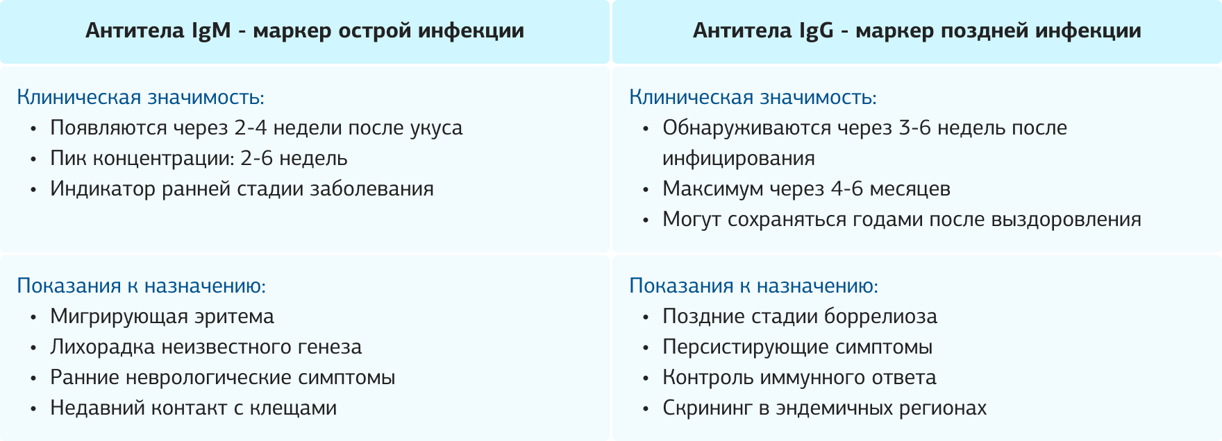 Клиническая значимость исследования IgM особенно высока в случае характерных ранних симптомов: мигрирующей эритемы, лихорадки неизвестного происхождения, ранних неврологических проявлений. Положительный результат у пациента с недавним контактом с клещами позволяет начать лечение до развития серьезных осложнений.