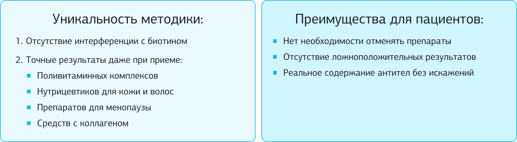 Биотин-независимая технология полностью исключает возможность такой интерференции, обеспечивая точные результаты независимо от диетических привычек пациента. Это означает, что пациентам не нужно прекращать прием важных для них препаратов перед сдачей анализов, а врачи могут быть уверены в достоверности полученных результатов.