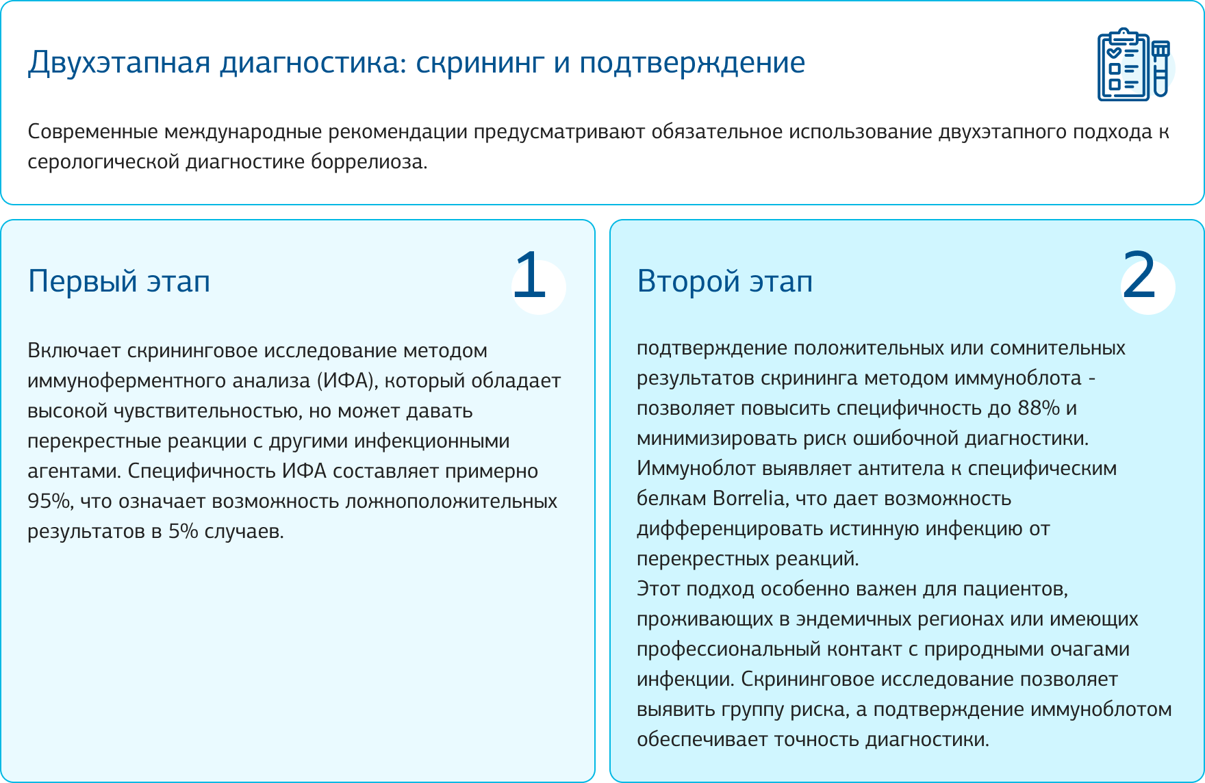 Диагностика боррелиоза остается сложной задачей, требующей интеграции клинических, эпидемиологических и лабораторных данных. Ни один из существующих методов не является универсальным, поэтому успех диагностики зависит от правильного выбора и интерпретации результатов различных видов исследований.