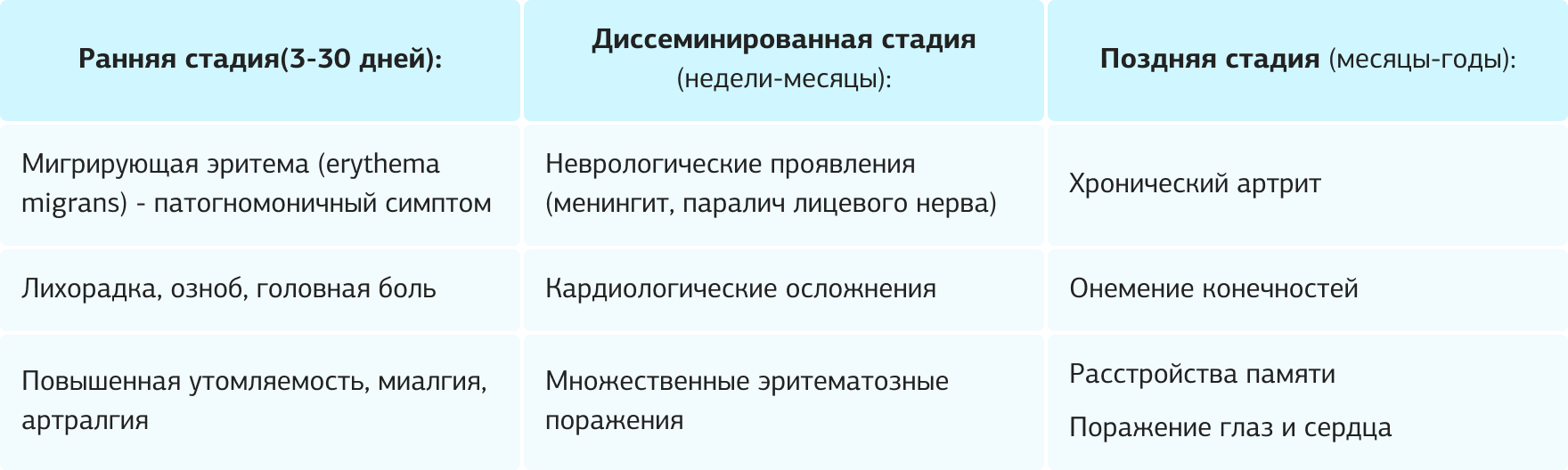 Симптомы ранней или поздней стадии болезни Лайма |