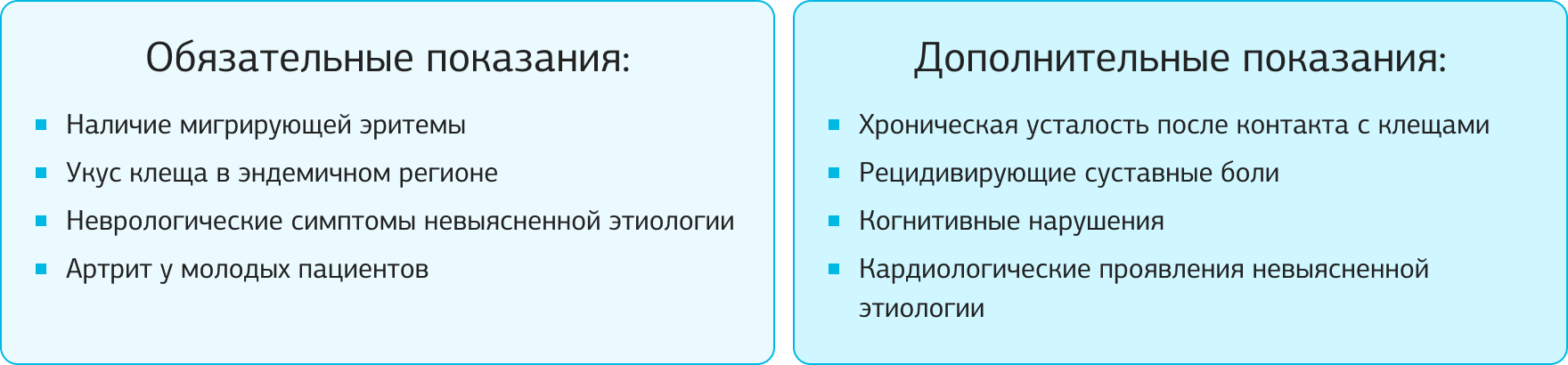 Хроническая усталость, когнитивные нарушения, рецидивирующие суставные боли могут быть проявлениями поздних стадий боррелиоза, особенно если в анамнезе есть упоминания о контакте с клещами или пребывании в лесистых местностях. Кардиологические проявления, такие как нарушение ритма или проводимости у молодых пациентов, также могут требовать исключения боррелиоза.