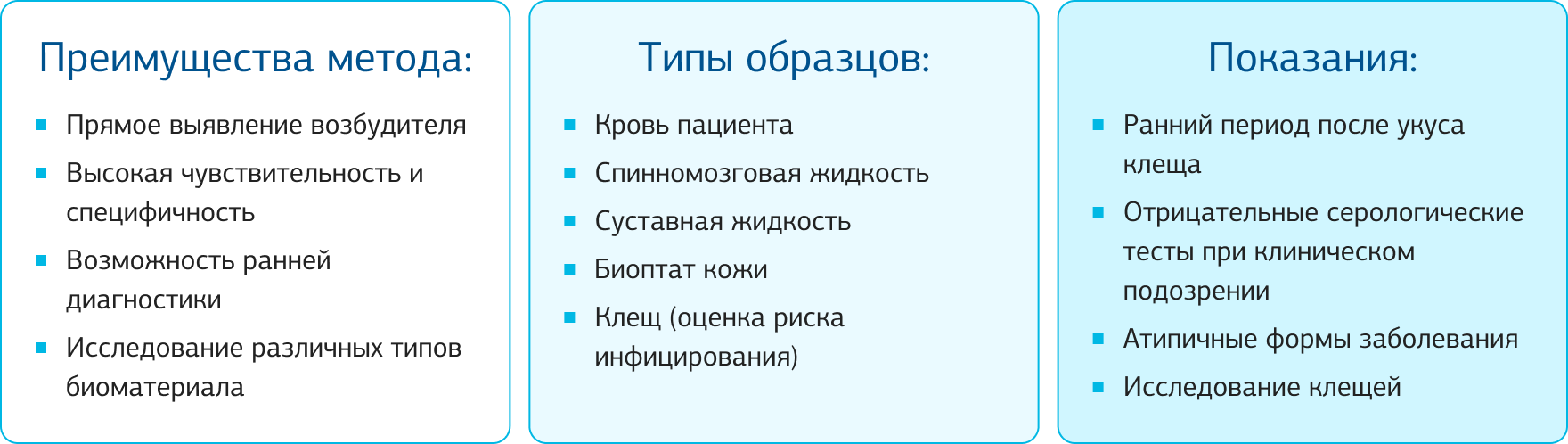 ПЦР способна выявить ДНК Borrelia burgdorferi sensu lato в различных типах биоматериала: крови, спинномозговой жидкости, суставной жидкости, биоптатах кожи. Особенно ценной является возможность исследования клещей, что позволяет оценить риск инфицирования еще до появления клинических симптомов.