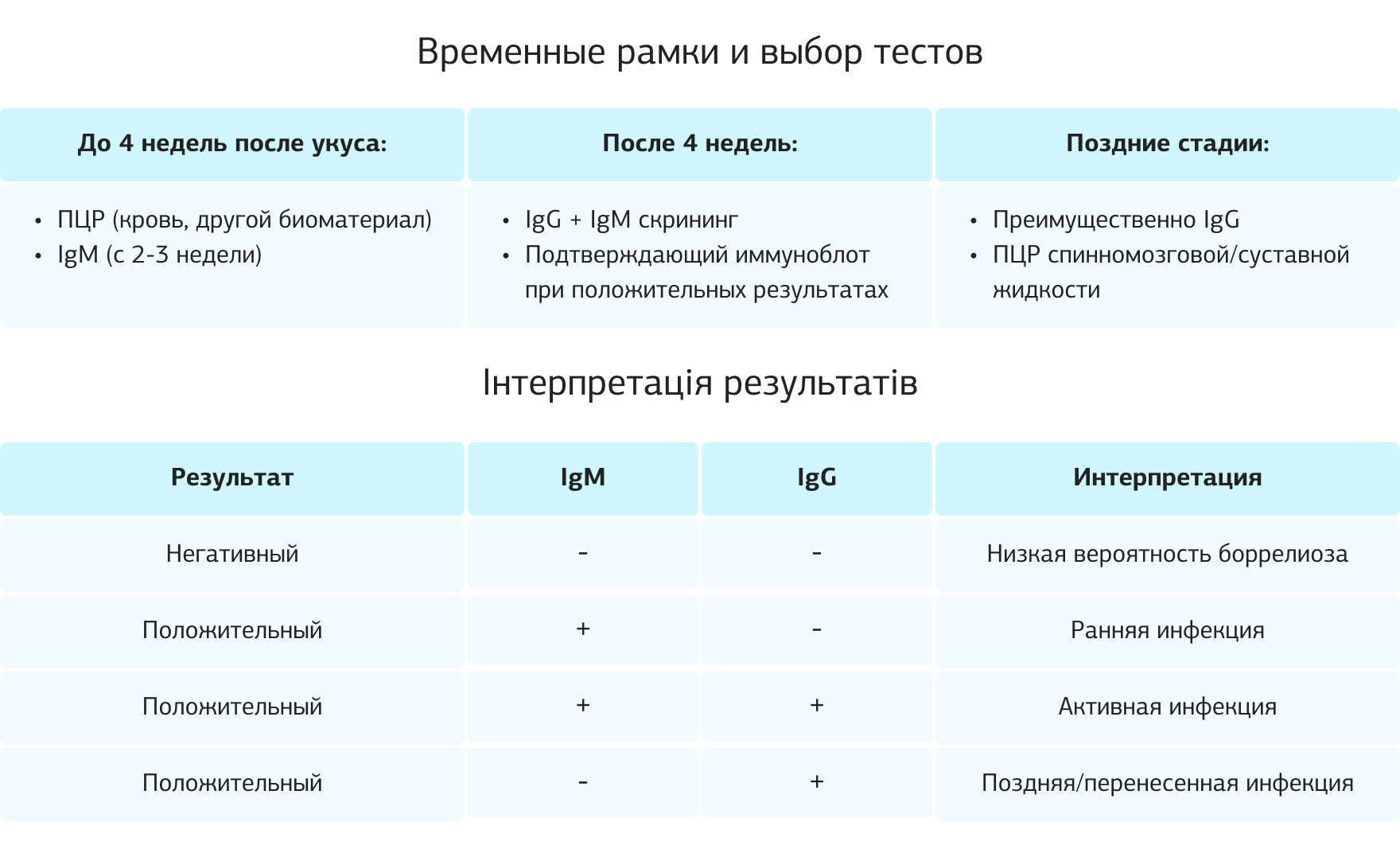 В раннем периоде, до 4 недель после укуса клеща, серологические методы могут быть малоинформативными из-за отсутствия или низкого уровня антител. В этот период наибольшую диагностическую ценность имеет ПЦР, которая позволяет выявить генетический материал возбудителя непосредственно в крови или другом биоматериале. Исследование IgM целесообразно начиная с 2-3 недели после вероятного инфицировани.