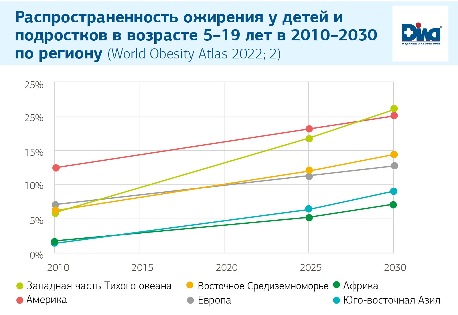 Распространенность ожирения у детей и подростков в возрасте 5–19 лет в 2010–2030 по региону (World Obesity Atlas 2022; 2)