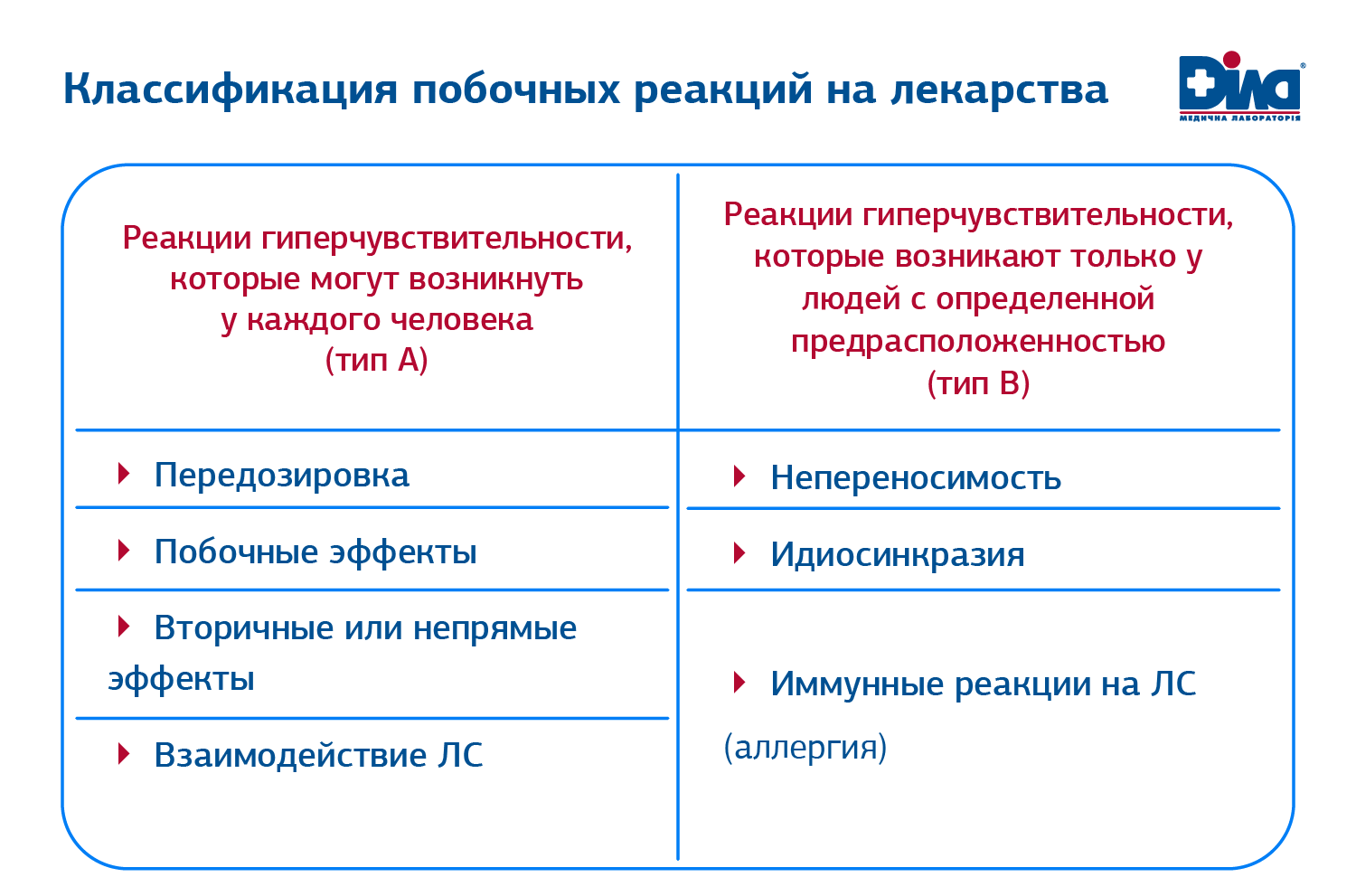 Побочные реакции на лекарственные средства (ПЛР) включают все нежелательные эффекты лекарств, которые возникают из-за присущих им фармакологических свойств (см. таб.1). Это одна из известных причин ошибочного диагноза "аллергия на лекарства". Поэтому в любом случае такой реакции важно уточнить механизм ее развития.