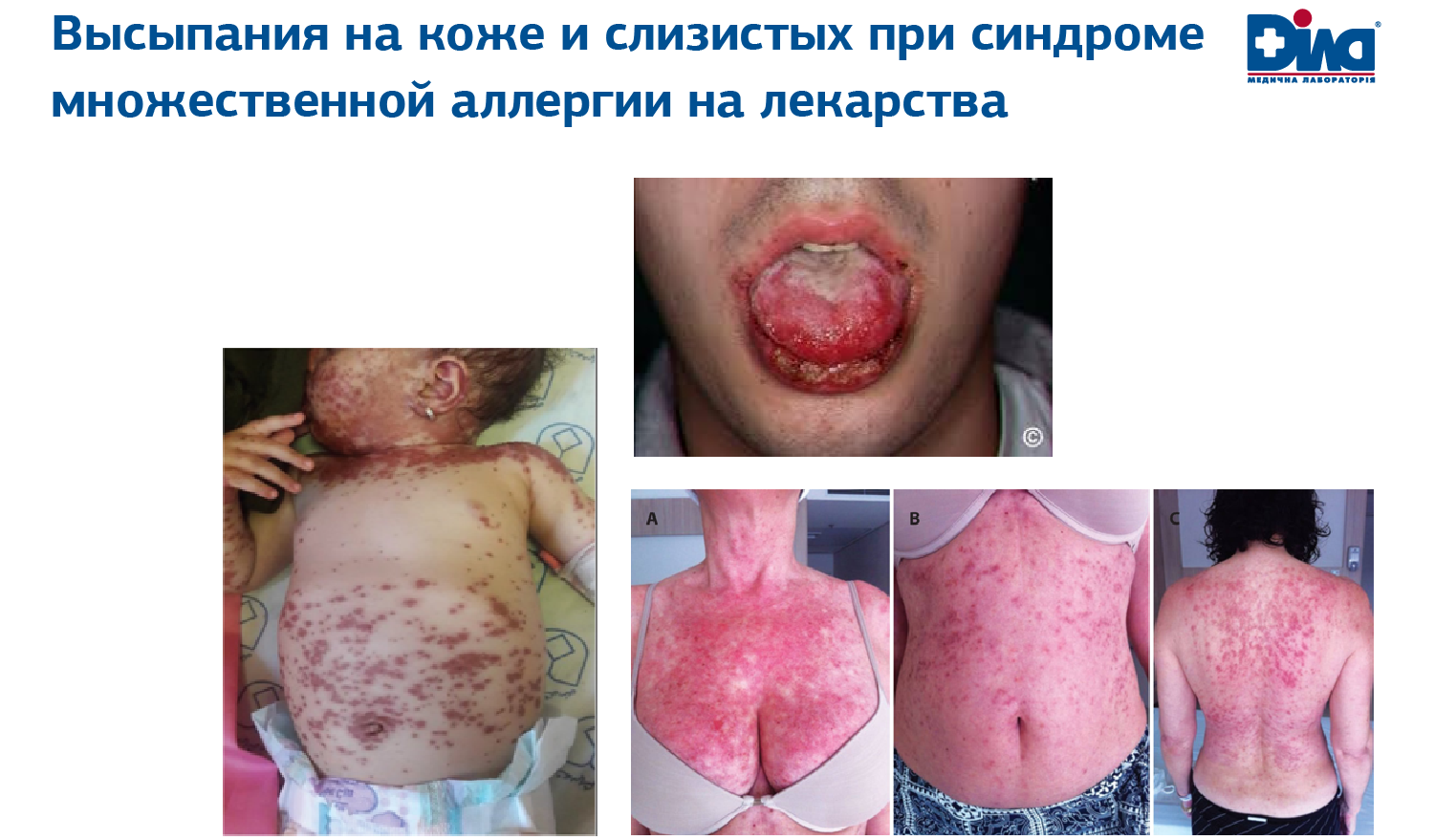 Симптомы множественной лекарственной аллергии подобны симптомам других аллергических реакций и зависят от типа иммунного ответа. Сегодня известно как минимум 4 основных типа иммунных реакций и каждая из них может быть причиной развития реакции при лечении. Наиболее опасными являются IgE зависимые реакции или реакции немедленного типа, так как есть риск развития анафилаксии. В то же время пациент с аллергией на лекарства может страдать от легкой, средней или тяжелой реакции. Частым признаком является сыпь на коже. У некоторых пациентов развиваются замедленные, но не менее опасные реакции - такие как синдром Стивенса-Джонсона/токсический эпидермальный некролиз (SJS/TEN) и реакция на лекарства с эозинофилией и системными симптомами (DRESS-синдром) (рис.1) https://www.scielo.br/j/abo/a/xZkBY5mM6HpZQS5w9SSCpWp/?lang=en#