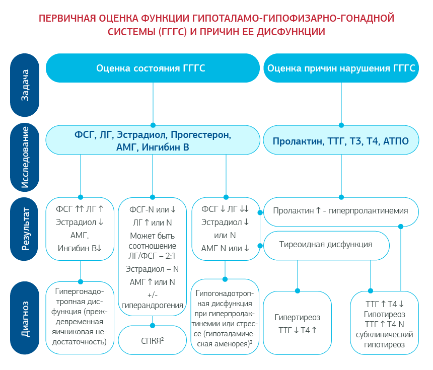 При наличии у женщины данных о нарушении менструального цикла, чрезмерный рост волос в гормонозависимых зонах, потерю волос, акне, колебания массы тела целесообразна оценка таких гормональных показателей как: ФСГЛГпролактинТТГиндекс свободного тестостерона.