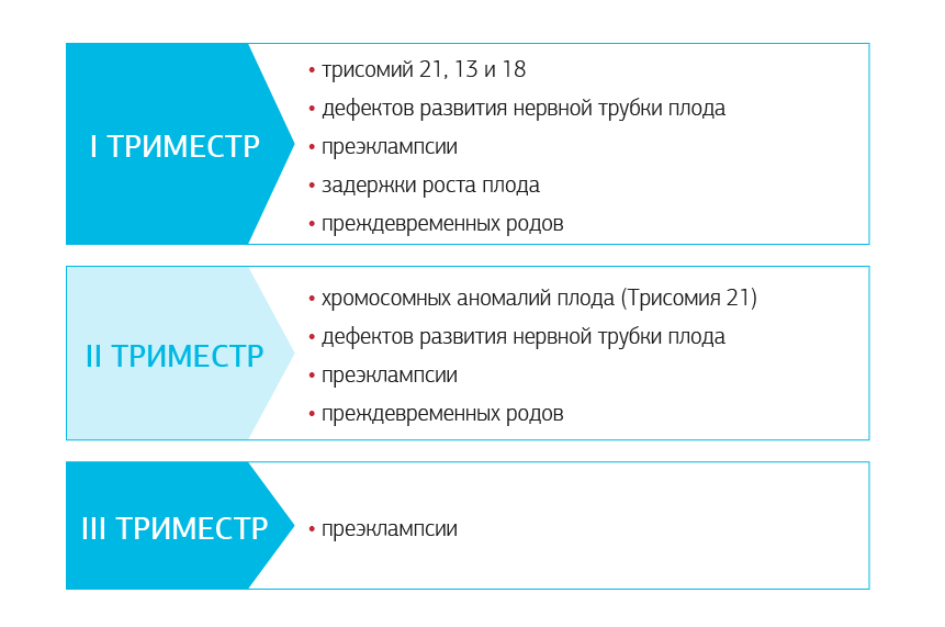 В зависимости от ставящейся задачи пренатальный скрининг охватывает все три триместра и, в зависимости от выбранного исследования, позволяет оценить риски: