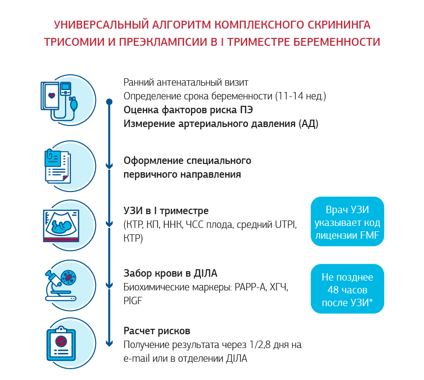 Универсальный алгоритм комплексного скрининга Трисомий, преэклампсии, ЗРП и преждевременных родов на примере исследования «Пренатальный скрининг I триместра с расчетом риска преэклампсии Astraia (PAPP-A, ХГЛ, PlGF)»
