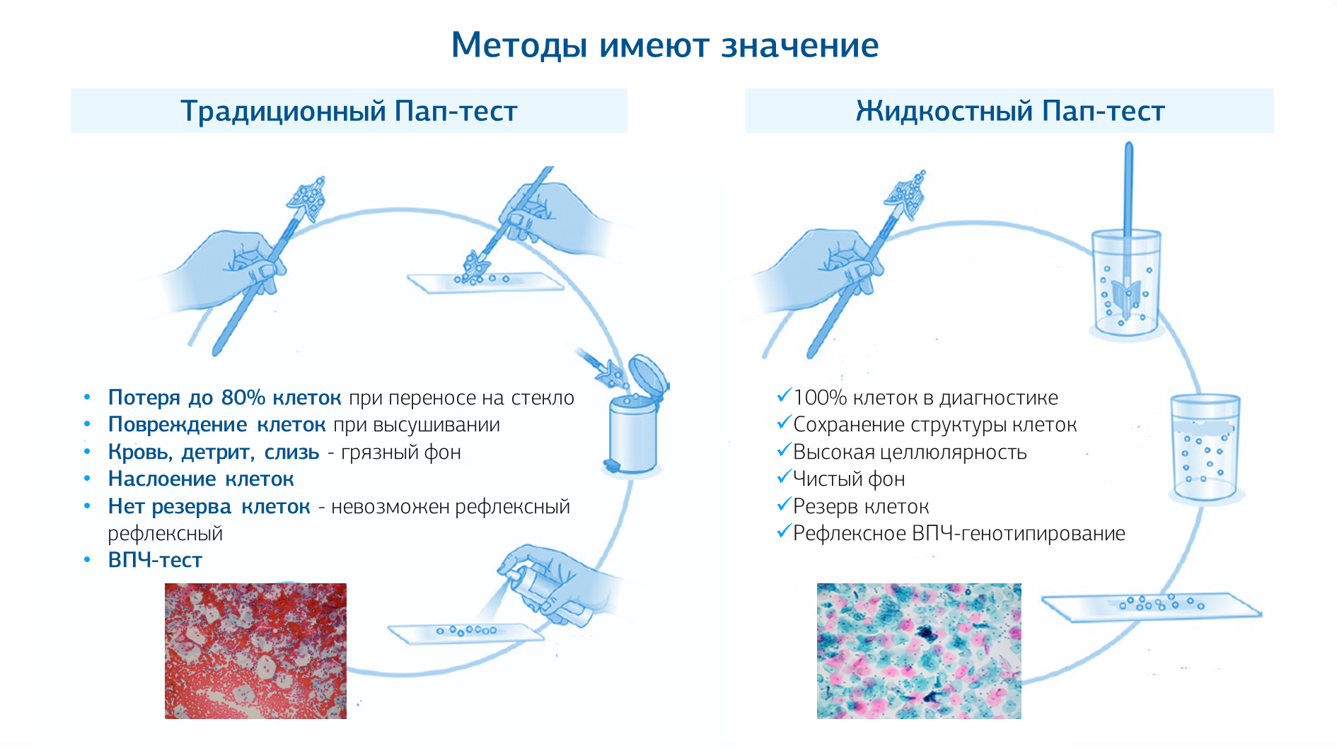 Пап-тест методом жидкостной цитологии, в частности, методики, рекомендованные для использования в программах цервикального скрининга, имеют значительные преимущества по сравнению с традиционным Пап-тестом (мазок на стекле).