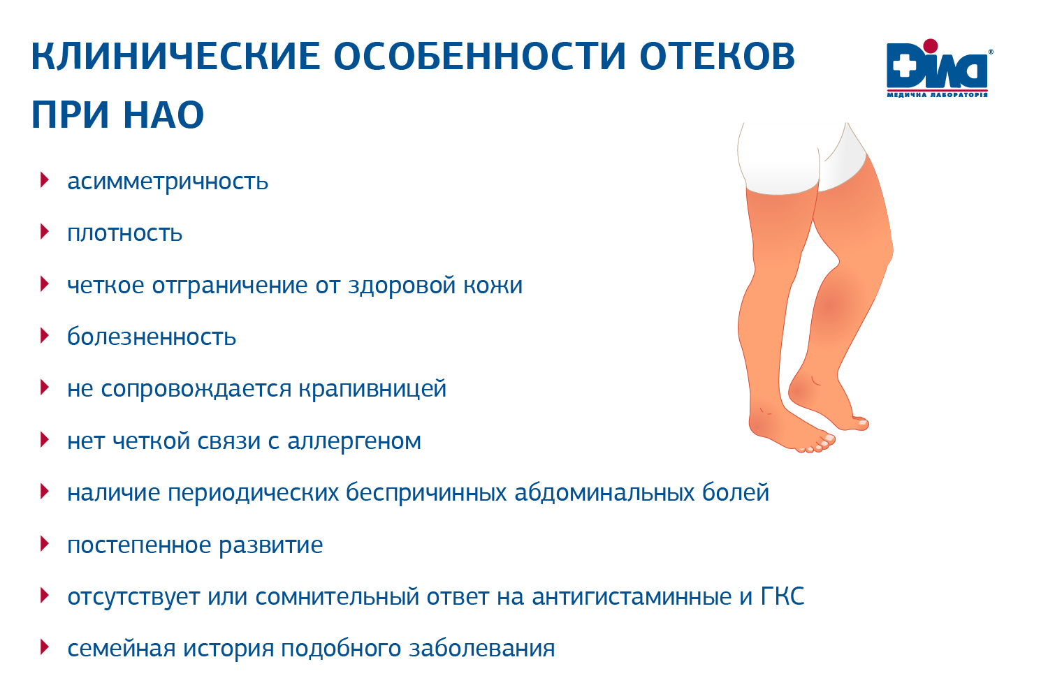 Отеки при НАО носят периодический характер, частота и тяжесть приступов имеют индивидуальную вариабельность.