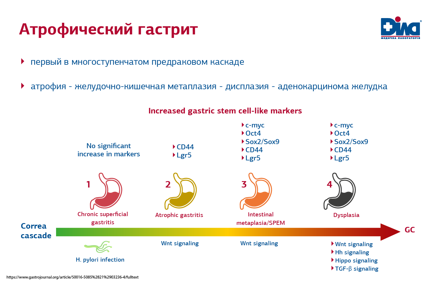 Каскад предраковых изменений при атрофическом гастрите: атрофия - желудочно-кишечная метаплазия - дисплазия - аденокарцинома желудка.