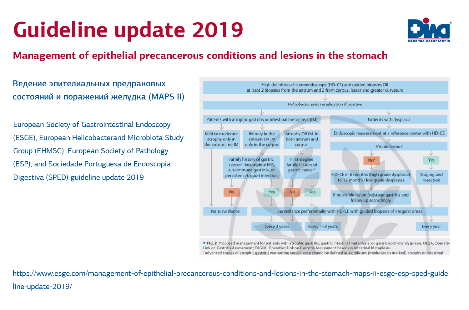 Больше информации по ведению больных с ХАГ, согласно полученным эндоскопическим данным, предоставляют обновленные гайдлайны, а именно Guideline update 2019: Ведение эпителиальных предраковых состояний и поражений желудка (MAPS II) https://www.esge. com/management-of-epithelial-precancerous-conditions-and-lesions-in-the-stomach-maps-ii-esge-esp-sped-guideline-update-2019/; Европейское общество желудочно-кишечной эндоскопии (ESGE), Европейская исследовательская группа по Helicobacter and Microbiota (EHMSG), Европейское общество патологии (ESP) и Sociedade Portuguesa de Endoscopia Digestiva (SPED) обновление рекомендаций 2019: