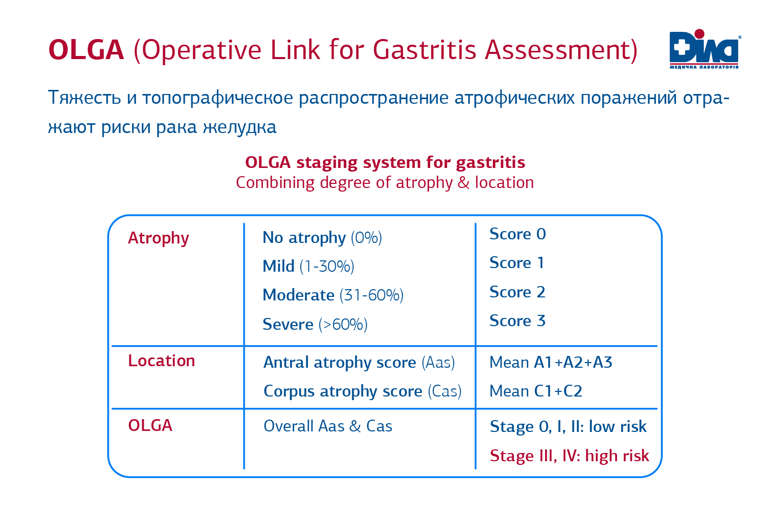 В 2008 году группа экспертов (M. Rugge, P. Correa, F. di Mario и др.) предложила новую классификацию ХГ - систему OLGA (Оperative Link for Gastritis Assessment), которая учитывала определенные недостатки Сиднейско-Хьюстонской классификации. В OLGA применяют оценку гистологических признаков выраженности воспаления и атрофии в антральном отделе и теле желудка с последующим определением интегральных показателей - степени и стадии гастрита. Под степенью гастрита понимают степень выраженности суммарной воспалительной инфильтрации, под стадией - степень выраженности атрофии. Система OLGA по сравнению с предыдущей классификацией позволяет повысить качество стратификации риска возникновения рака желудка у пациента. Имеется в виду, что чем больше степень выраженности атрофии и объем поражения, тем выше риск рака.