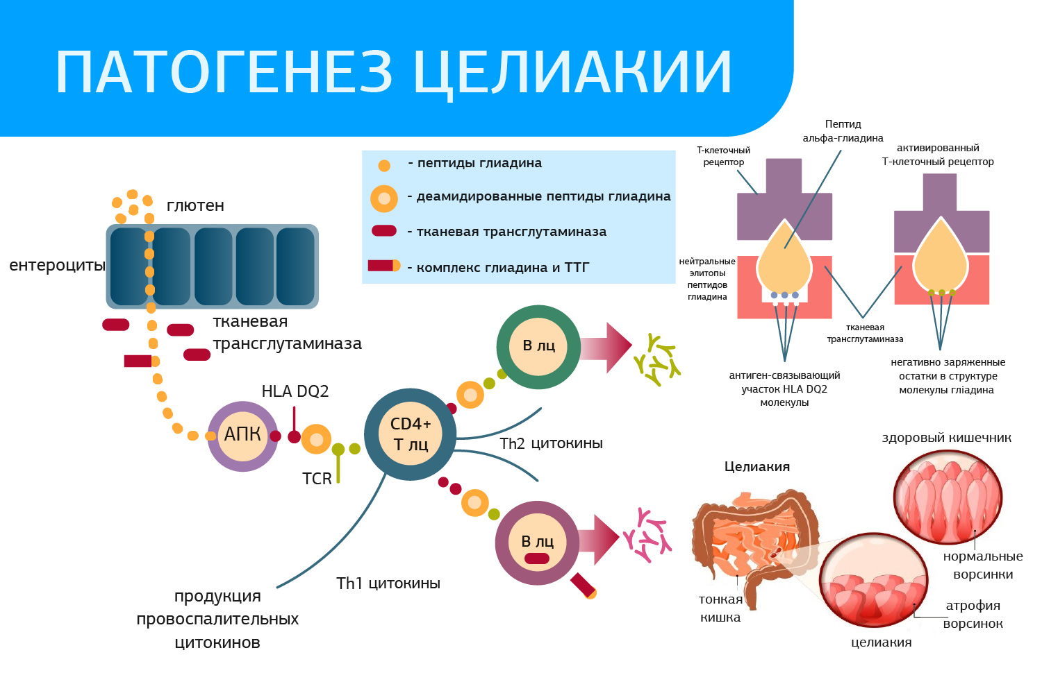 Важно отметить, что если в рационе присутствует глютен, иммунная система больного целиакией находится под постоянным антигенным давлением, вследствие чего могут возникать другие аутоиммунные заболевания. Под влиянием глютена образуются специфические антитела (к тканевой трансглютаминазе типа 2 [tTG], антиэндомизиальные [EMA], к дезаминированным пептидам глиадина [DGP]) и развивается аутоиммунная воспалительная реакция, которая приводит к атрофии ворсинок слизистой оболочки тонкого кишечника.