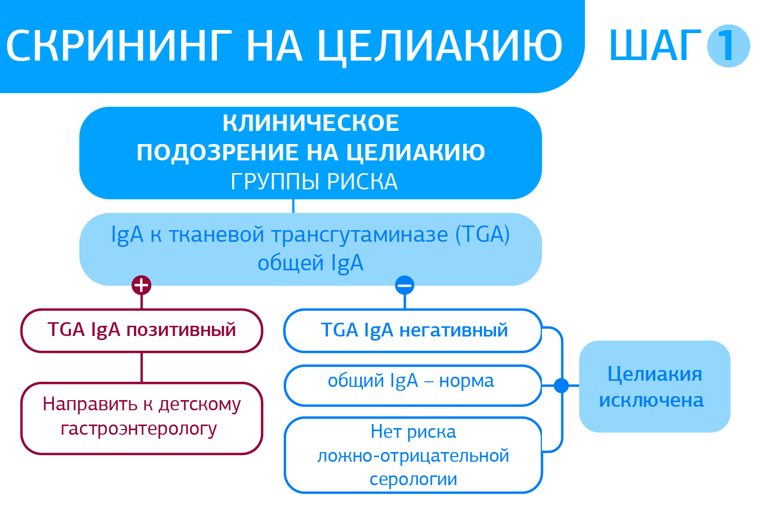 1. Серологическое тестирование положительное, следующий шаг – биопсия из тонкого кишечника.