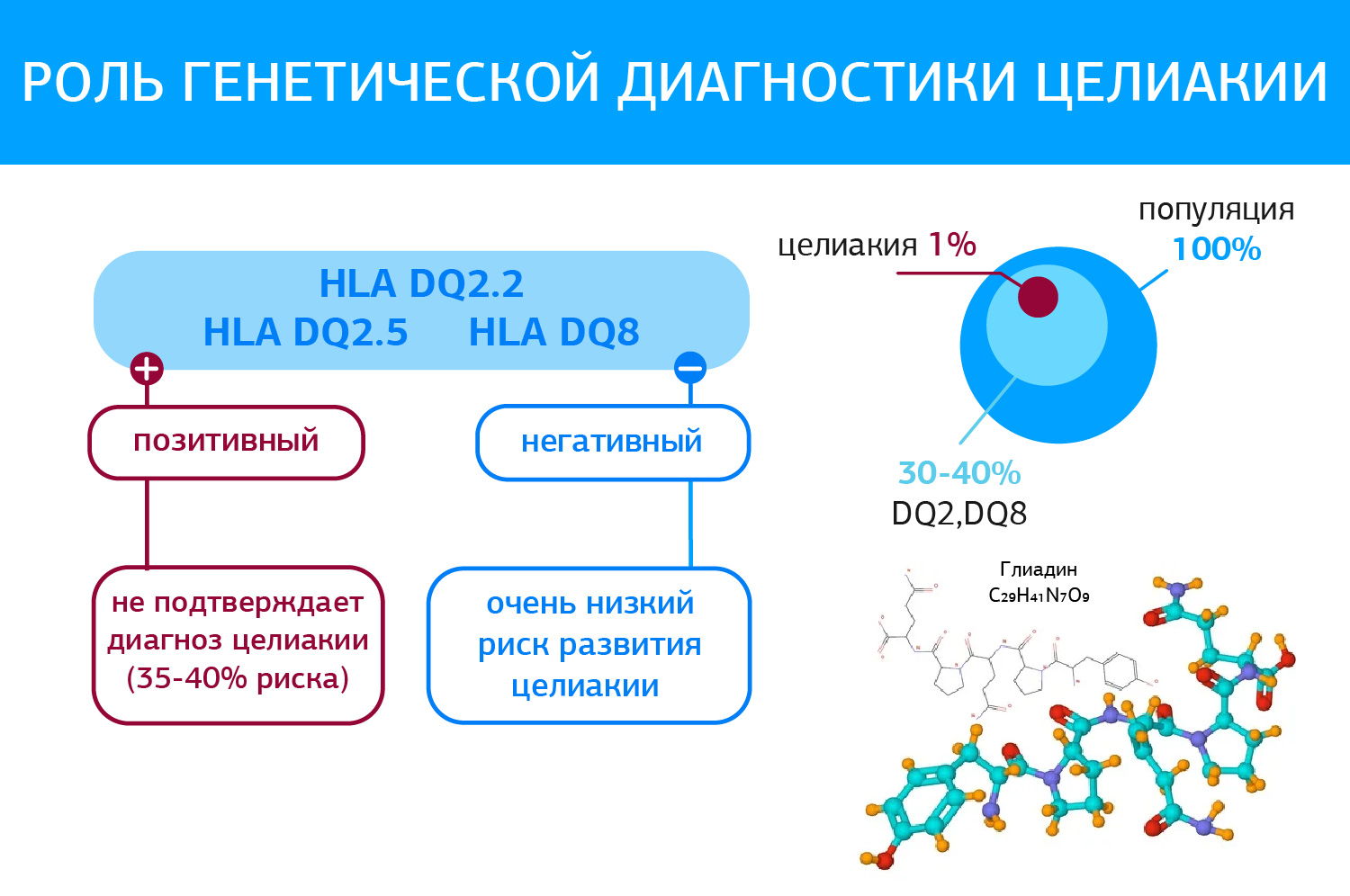 Генетические исследования исключают, а не подтверждают диагноз, поскольку 35-40% популяции являются носителями генов, ассоциированных с целиакией, согласно рекомендациям (Al-Toma A, Volta U, Auricchio R, et al. European Society for Study of Coeliac Disease ((ESsCD) guideline for coeliac disease and other gluten-related disorders. United European Gastroenterol J. 2019; У пациентов с подтвержденной целиакией определяются HLA-DQ2.5 – в 90-95%, а HLA-DQ2.2 и HLA-DQ8 – в 5-10%. Отсутствие генотипов HLA-DQ2 или DQ8 исключает диагноз целиакии.